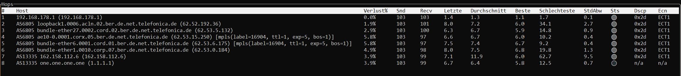 nach einem IPv4 Test gefragt… (Achtung, kein Hop schuldet Dir ICMP Antworten, daher kann es immer wieder mal zu Paketverlust bei bestimmten Hops entlang eines Netzwerkpfades kommen, aber wenn der Paketverlust ab Hop N bis zum Ende konstant erhoeht ist, deutet dass stark die Hops N-1 und N als moegliche Verlustquellen hin).
