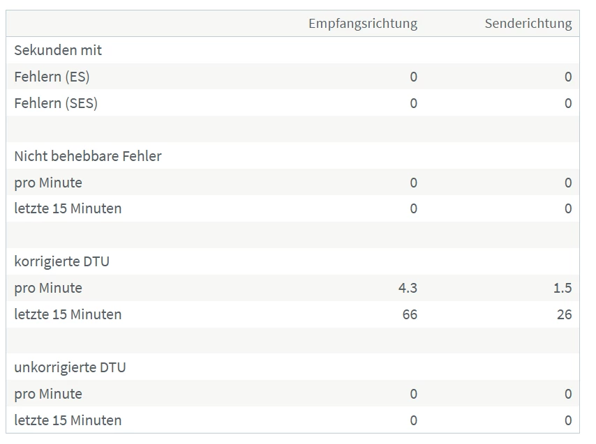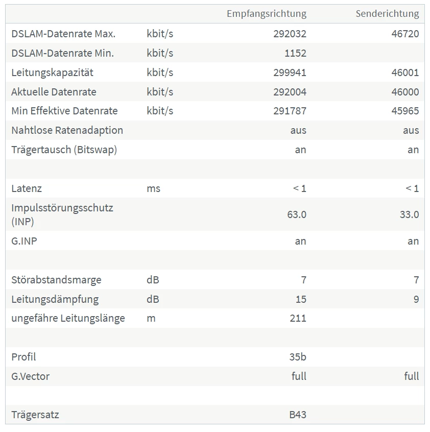 Danke, das sieht erstmal nicht nach massiven DSL-Signalproblermen aus, aber da waeren die Spektren mit Minim und Maxima hilfreich… die Stoerabstandsmarge ist mit 7 dB etwas niedrig (das Minimum ist wohl 6dB) aber die geringe Anzahl korrigierter DTU spricht gegen massive Stoerungen, zumindest in den 15 Minuten vor der Messung. bKeinesfalls genug um knapp 6% Paketverlust zu erklaeren.