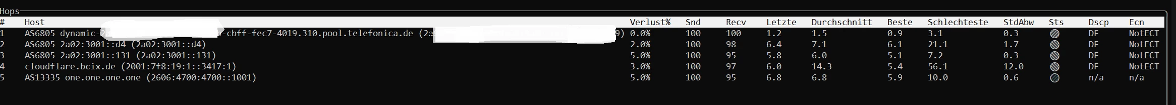 Der Verlust tritt also bereits am ersten O2 Hop nach Deinem Router auf (das kann dann schon auch das WAN Interface vom Router sein) und bleibt bestaendig bis zum Endhost. Das ist zumindest ein Indiz dafuer dass Deine Problem in Deiner Naehe enstehen, also zwischen Roputer und erstem O2-Hop (der allerdings schon ein gutes Stueck weit sein kann). Bei IPv6 geben die O2-DNS Server keine nuetzlichen Namen her die weitere Hypothesen zulassen, daher hatte ich mit: