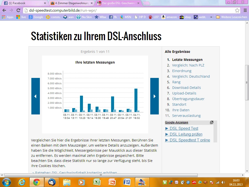 Ende Juli war noch alles in Ordnung. Ich hatte eine Downloadrate von durchschnittlich 13 Mbit/s (der Download schwankte zwischen 1,1 und 1,6 MB/s), der Upload eines 1 GB großen Videos bei YouTube (ja, ich lade da Videos hoch) dauert mal mehr, mal weniger als 2 Stunden was ungefähr einer Uploadrate von ca. 1,4 Mb/s entspricht, wenn ich mich da nicht vertue. Mit Speedtests habe ich mich nicht wirklich abgeplagt, weil ich keine Probleme mit Stabilität oder Geschwindigkeit hatte. Dass ich nicht auf 16k kommen konnte, daran hatte ich mich schon gewöhnt. 13k waren ausreichend!