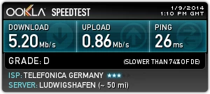 EDIT: Die Downloadgeschwindigkeit beträgt jetzt so um die 6,1 Mbit/s - also schon mal mehr als doppelt so viel wie vorher! Der Ping ist auch mal wieder unter der 100er-Marke - beim Upload sind es gerade 0,26 Mbit/s gewesen.