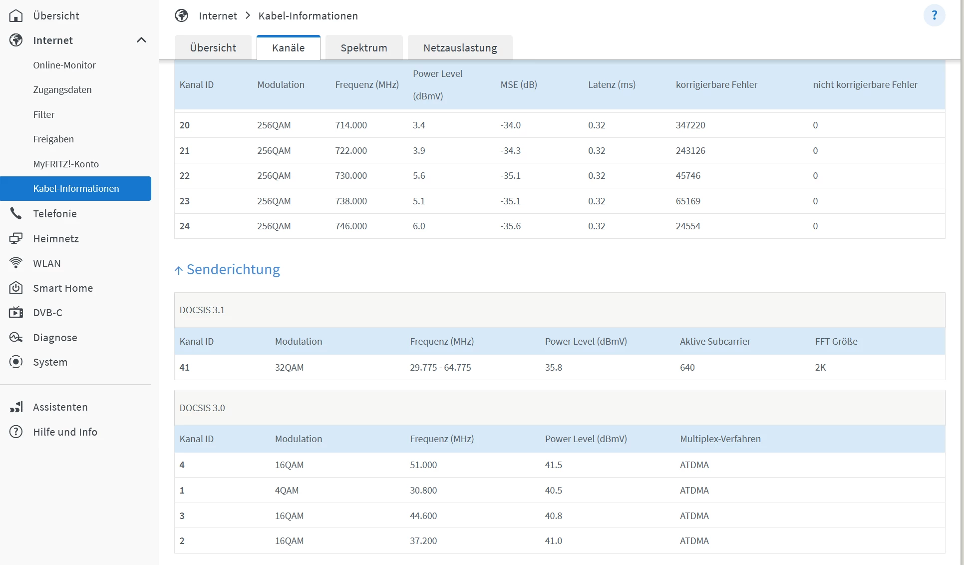 seid geraumer Zeit sind die Pegelwerte an meiner FritzBox 6591 im Uploadbereich alles andere als gut. Zum Teil bricht dieser von 50 auf 10 abends ein, Ping geht auch etwas länger.