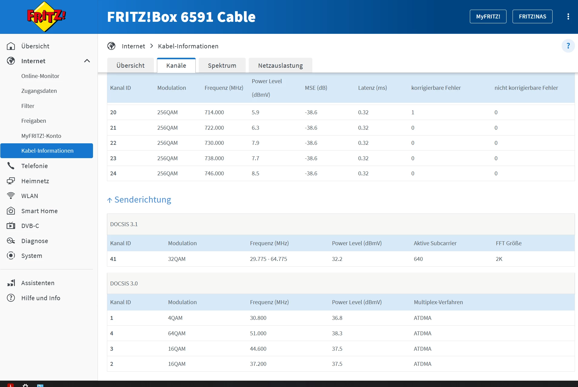 andere 6591 angeschlossen, selbe Werte. Verkabelung von Dose zum Router ist neu, Schwaiger 5 fach geschirmtes Koax Kabel ist neu, Verteiler inkl Dose keine zwei Jahre alt.