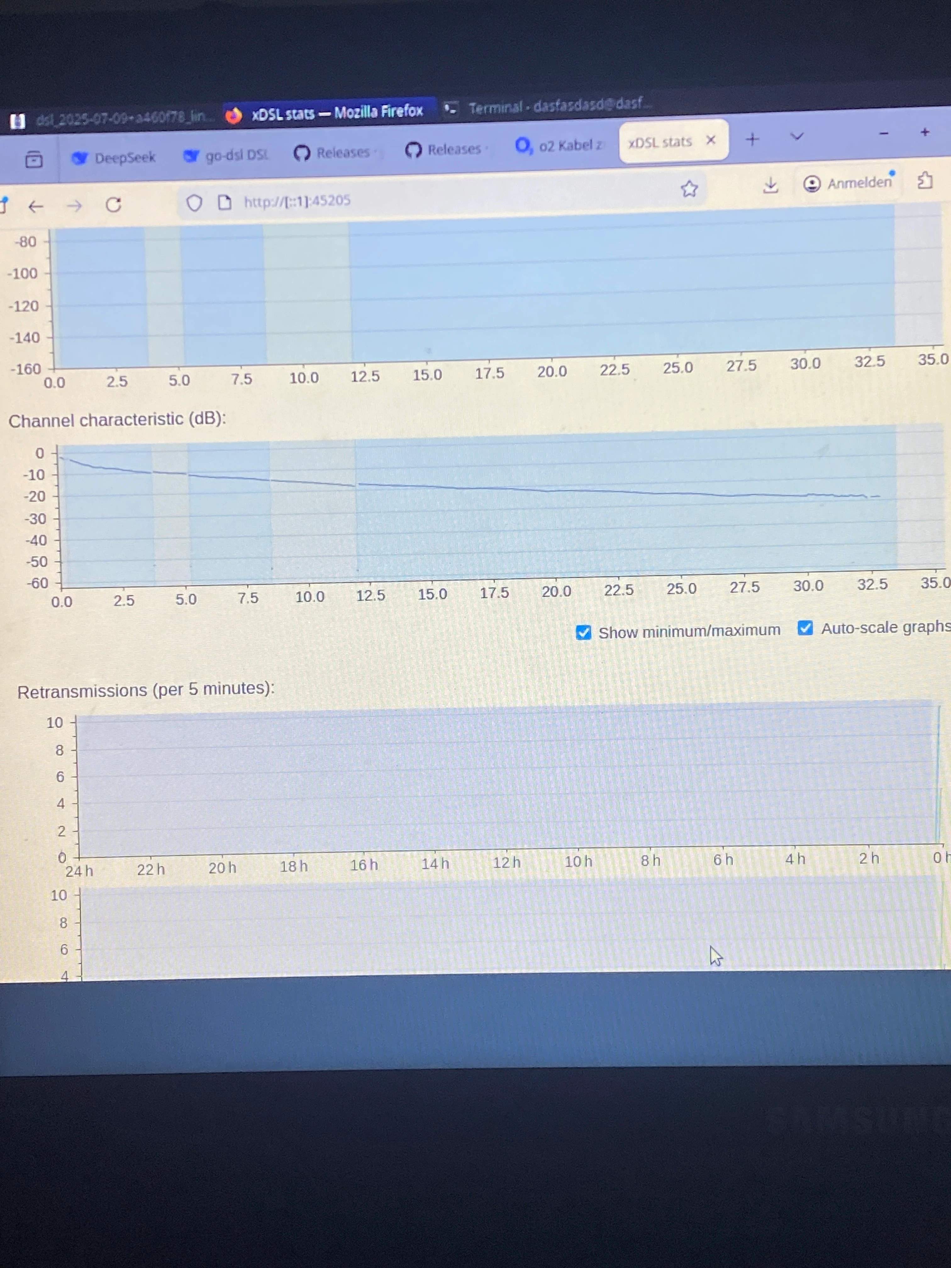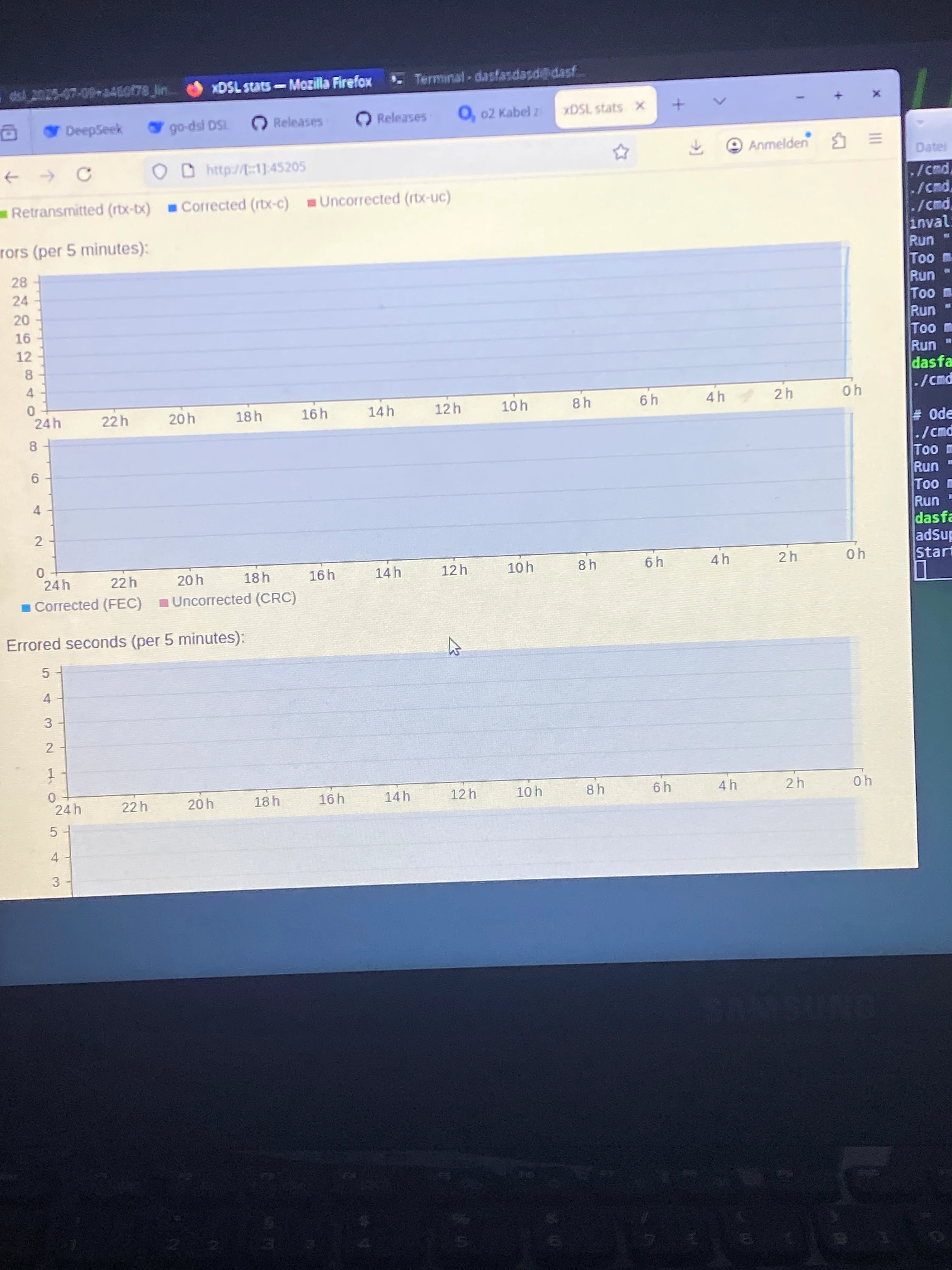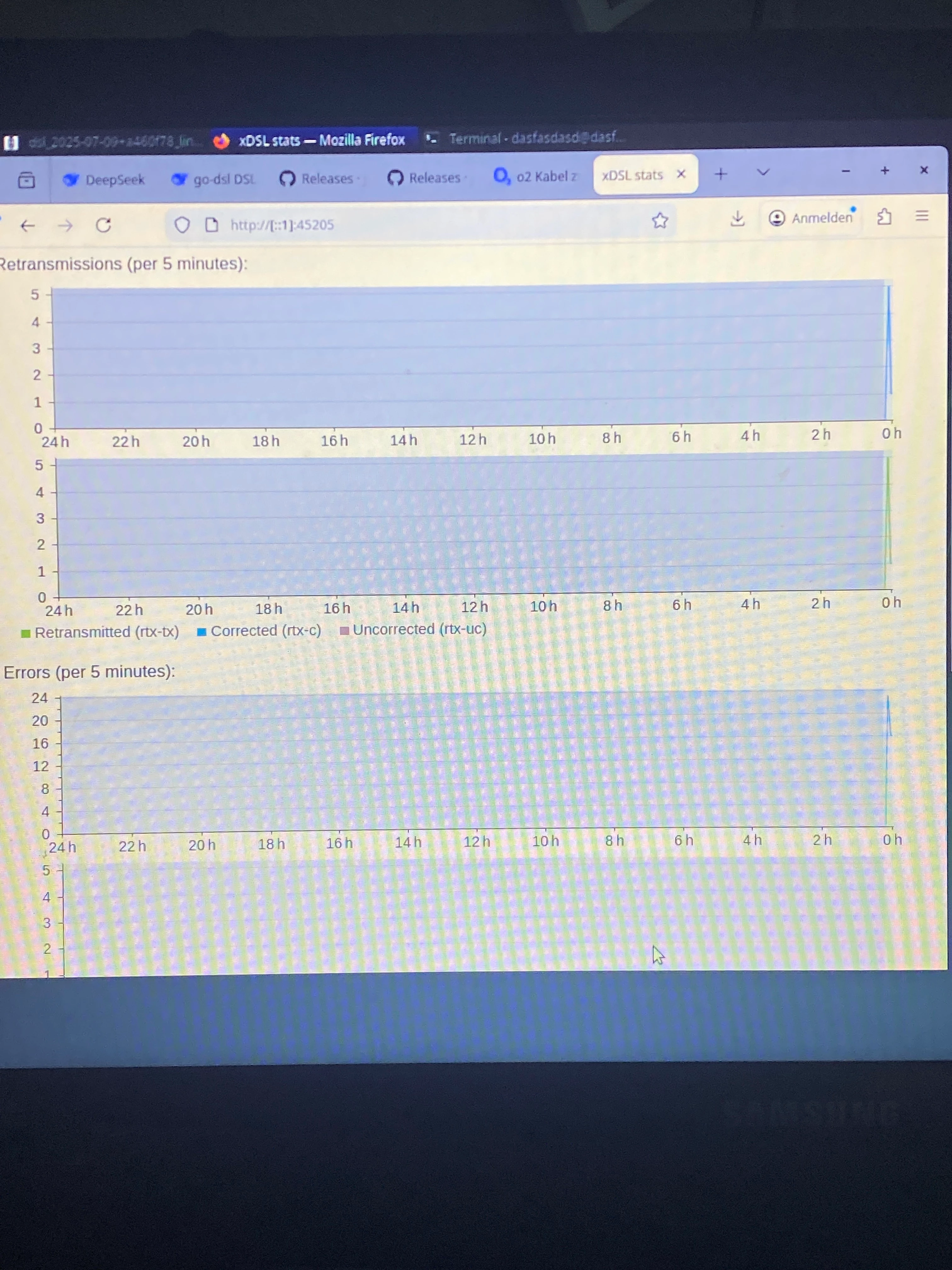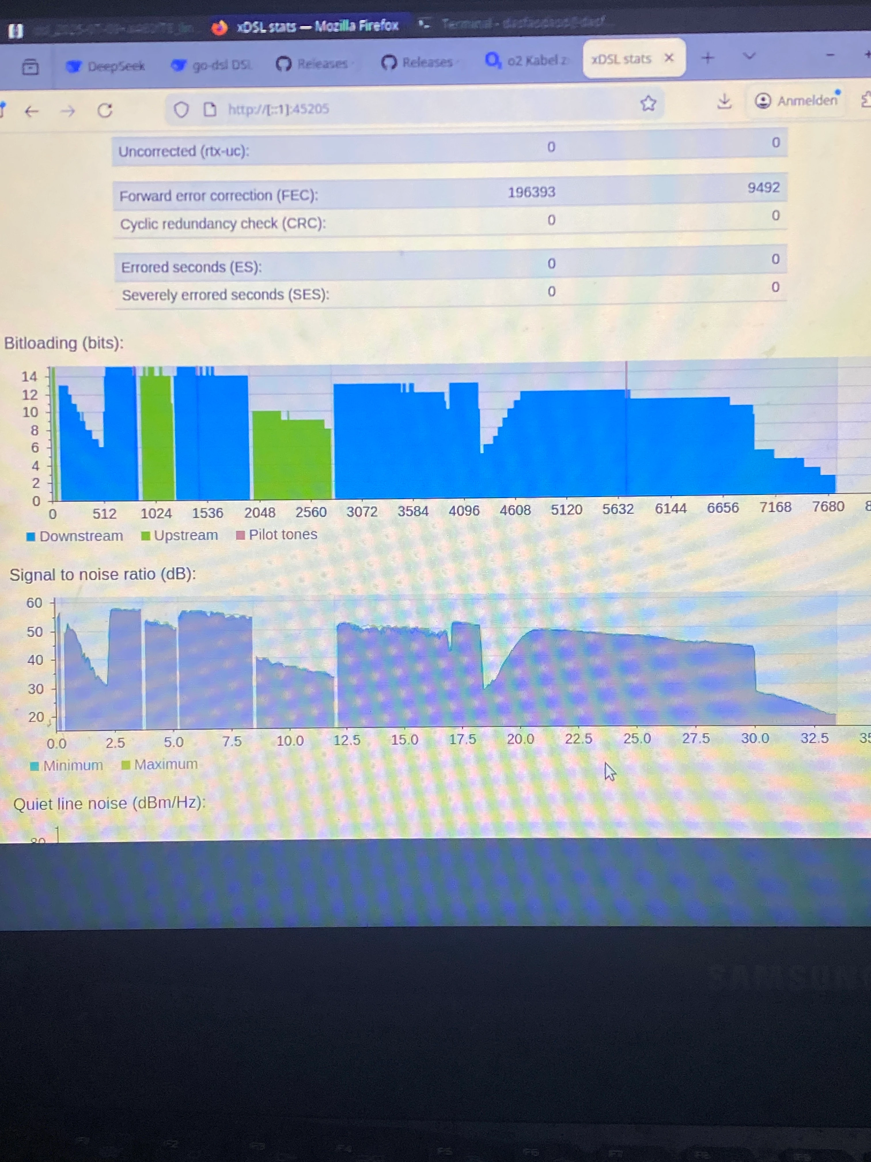 Als Ergänzung zu den Screenshots der Fritzbox wäre es schön, wenn Du go-dsl installieren könntest (https://github.com/janh/go-dsl , Binaries gibt es dort unter https://github.com/janh/go-dsl/releases) und einen Screenshot machen könntest, dabei bitte go-dsl mit dem folgenden Befehl ausführen: