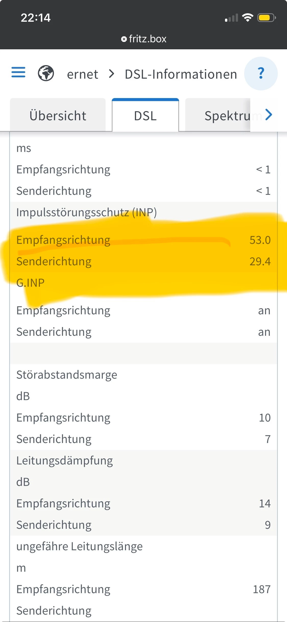 Hi liebe Community, da bin Ich wieder mal. Hab wieder etwas Zeit gefunden zum zocken und natürlich besteht dieses Phänomen was ich damals beschrieben habe immer noch. Möchte jetzt nicht alles wieder von vorne Anfangen. Ich habe eine Stabile Leitung das nicht abbricht und seid dem Störungsticket sind auch die unkorierbare Dtu nicht vorhanden also keine fehler. Ich habe schlicht und  einfach nen Krassen Delay ,also verzögerung beim spielen. Hab mich nun viel eingelesen und MÖCHTE einfach nur fragen OB es O2 Möglich ist meinen INP Wert zu reduzieren? Denn auf der FB Zeigt sende Richtung 30 und der empfang 60 . Füge mal Foto bei . Wäre echt nett das mal auszuprobieren. Bedanke mich