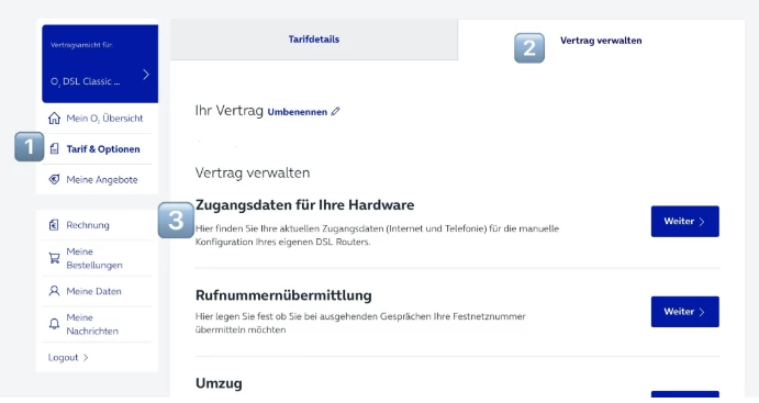 Wenn du sowohl einen o2 Mobilfunkvertrag als auch einen o2 Festnetzvertrag unter der selben Kundennummer führst (eine gemeinsame Rechnung für beide Verträge), dann musst du nach dem Login in “Mein o2” oben links den zu verwaltenden Vertrag auswählen. Wenn du dort den Mobilfunkvertrag auswählst, können dir keine Zugangsdaten für den DSL-Vertrag angezeigt werden.