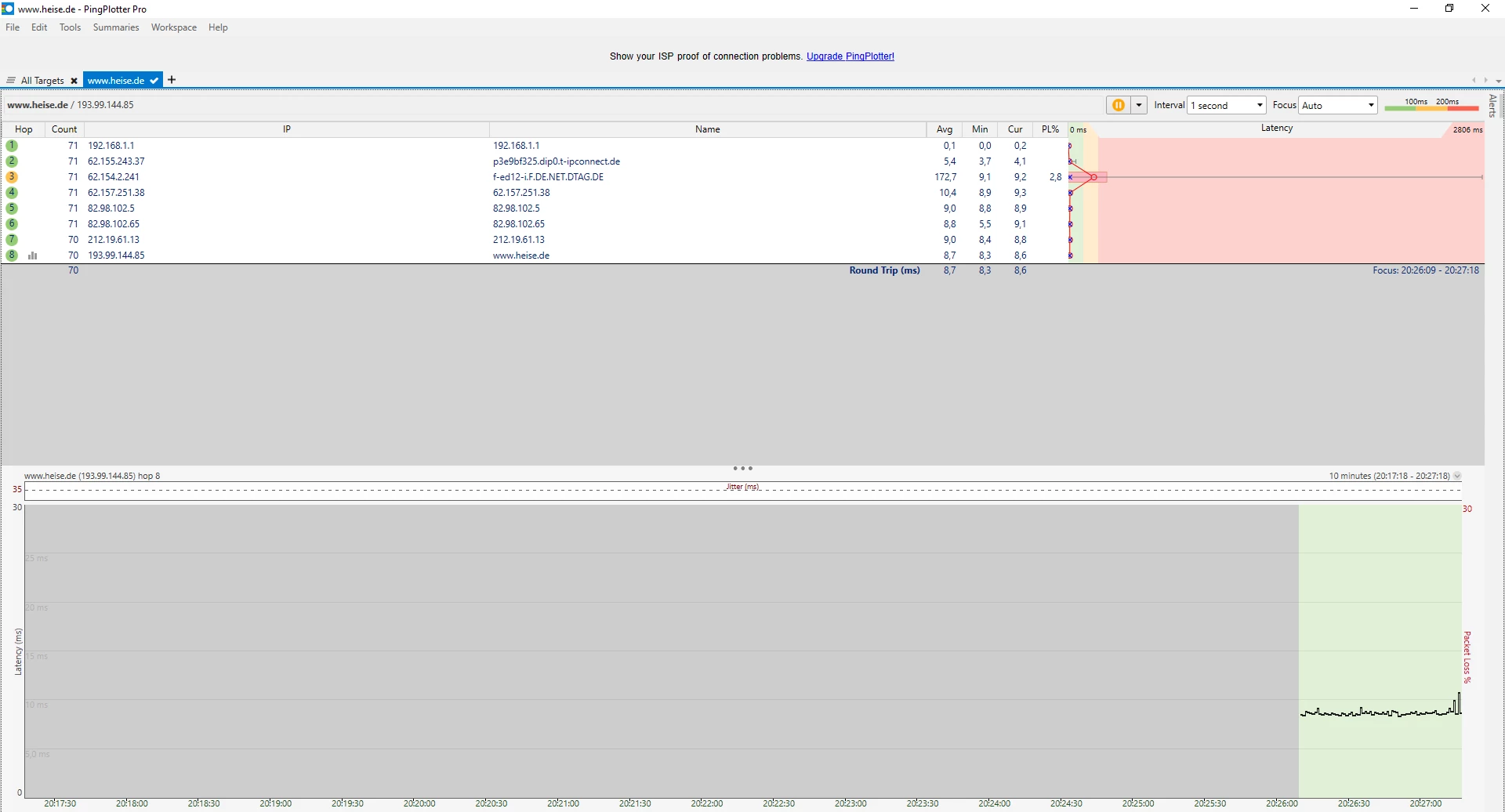 4.) Es gibt überhaupt keinen Anhaltspunkt, dass es am Internet liegt. Alle Werten sehen top aus, keine Abbrüche, volle Leistung, kein Packetloss wird angezeigt, der Leitungsweg ist bei mir sehr kurz.