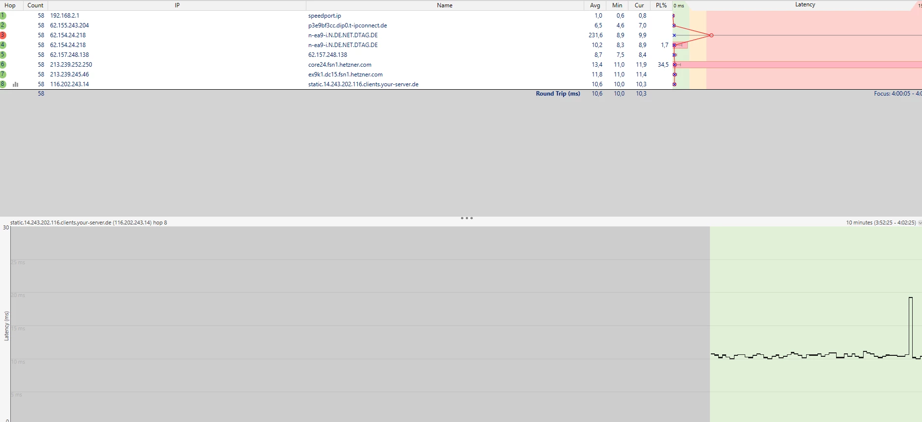 also ich benutz das programm pingplotter, dadurch konnte ich erst mal richtig feststellen, woher das problem kommt. ich bin bei telekom und spiele seit langer zeit ein älteres spiel mit einer kleinen community, es gibt dort einen eu server, der ist von hetzner und steht in falkenstein, nicht weit entfernt von mir. habe erst gedacht, es liegt an hetzner, aber wie ich feststellen konnte, habe ich fast bei jeder anderen ip adresse packetloss, immer vom DTAG netz aus, meistens hop 3 und 4. ich habe ingame einen super ping, bemerke aber regelmäßige ping spikes, der ping schießt nicht wirklich hoch, aber wechselt sich extrem schnell. ich bin top3 player in dem spiel und weiß ganz genau, dass dieses bad aim mit meiner connection zusammenhängt. ich muss dazu auch sagen, es gibt viele leute, die interessieren sich für sowas gar nicht, also bemerken sie es auch nicht und somit wissen die meisten sowieso nicht, von welcher problematik man da redet. kenne auch aus der community nur einen, der das gleiche problem hat, wie ich. die meisten denken sich nur, “hey du hast nen 9er ping, das ist doch super, was heulst du denn rum.” ja schön und gut, gefühlt ist es aber leider so, als würde ich auf einem NA server spielen.