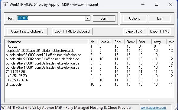In dem Trace ist kein relevanter Paketverlust erkennbar, der Endpunkt dns.google hat 10 von 10 Anfragen beantwortet.