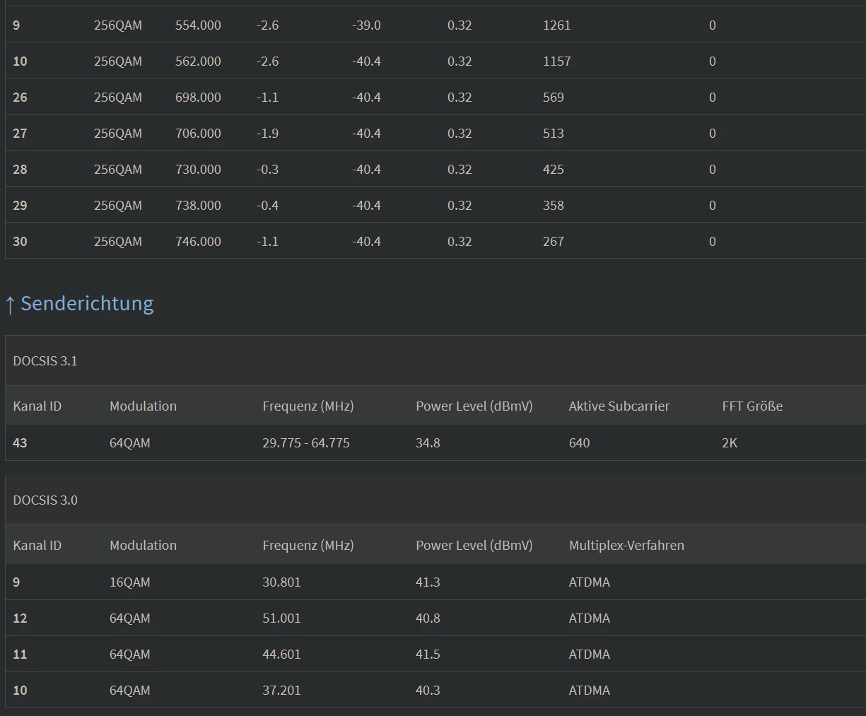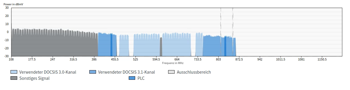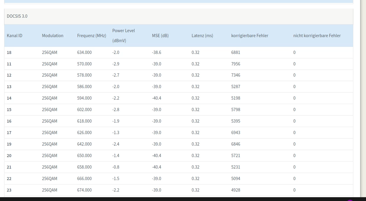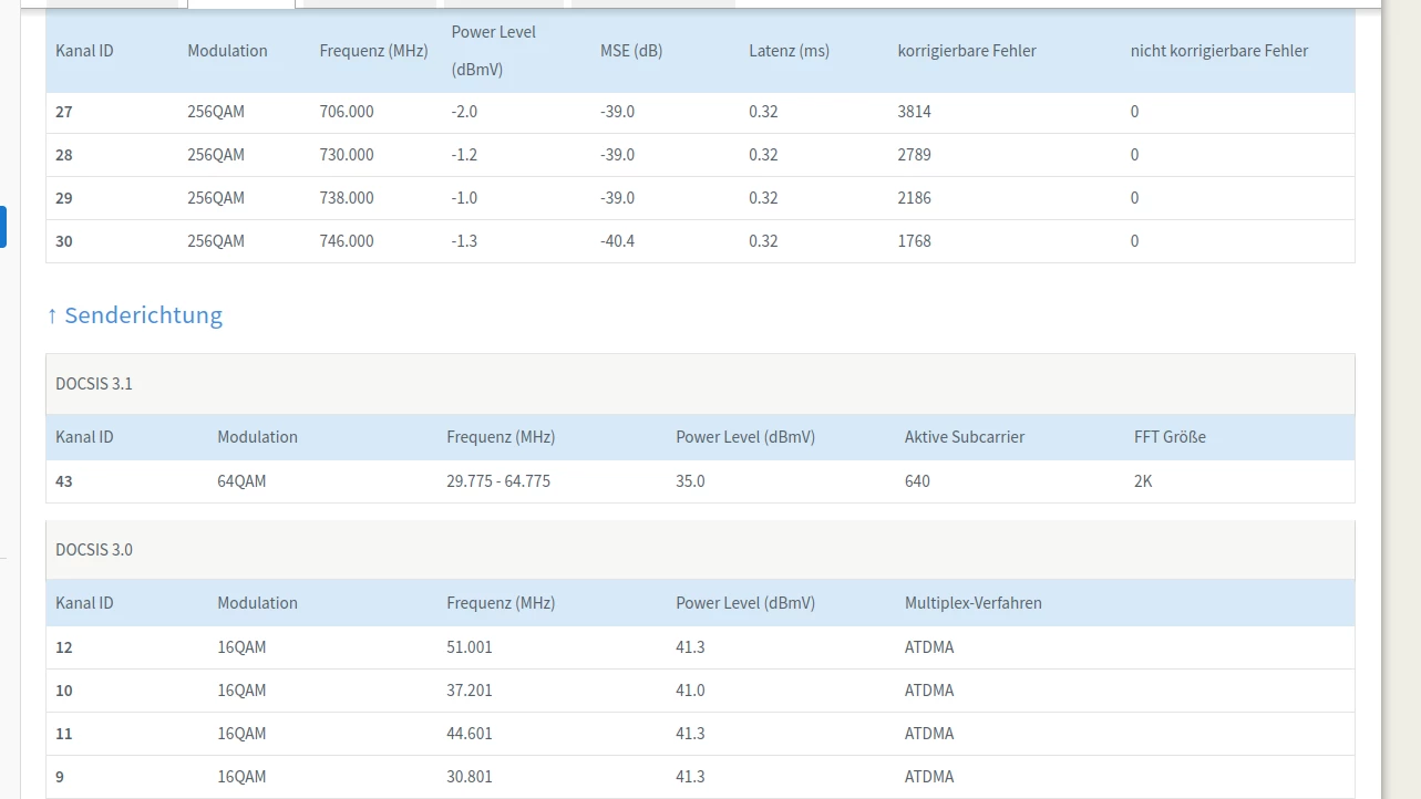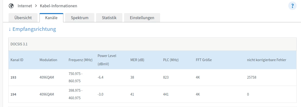 Dass Soll in Empfangsrichtung ist 4096QAM, für Docsis 3.1 (D3.1) und 256QAM für Docsis 3.0 (D3.0)).