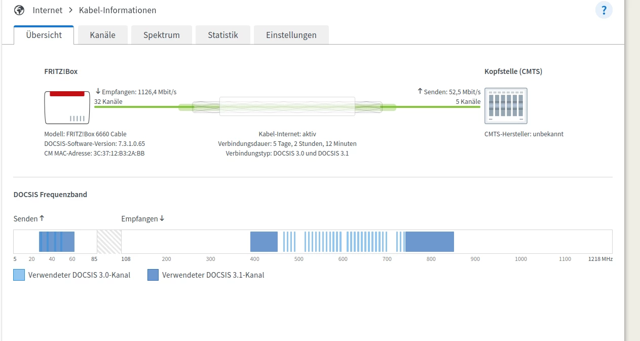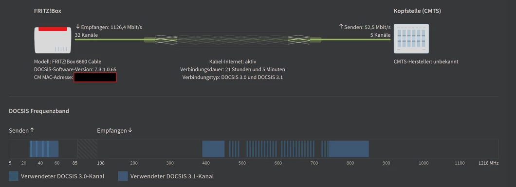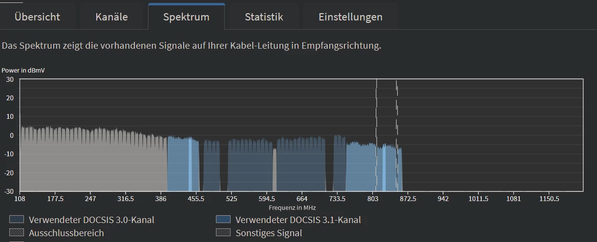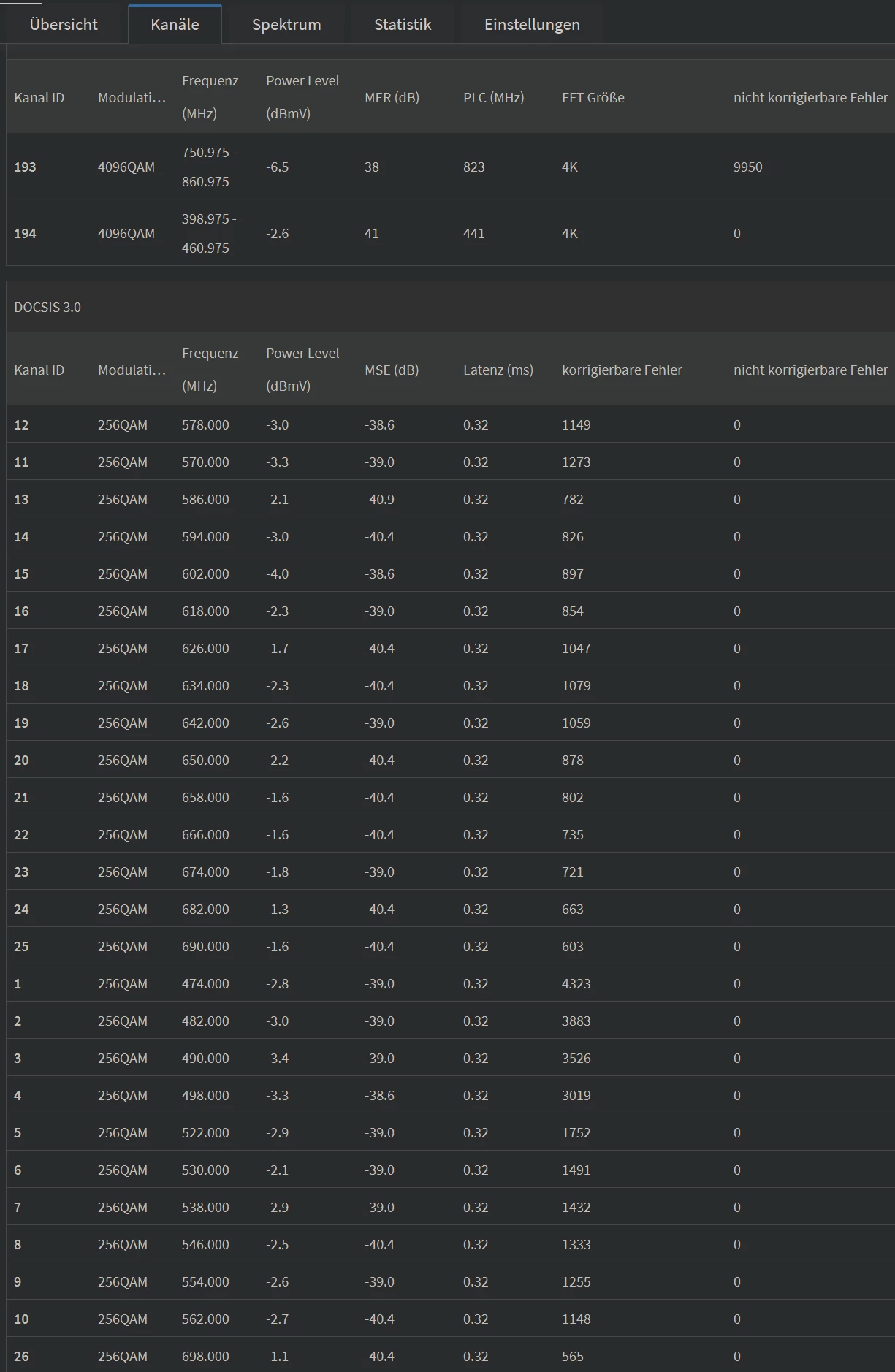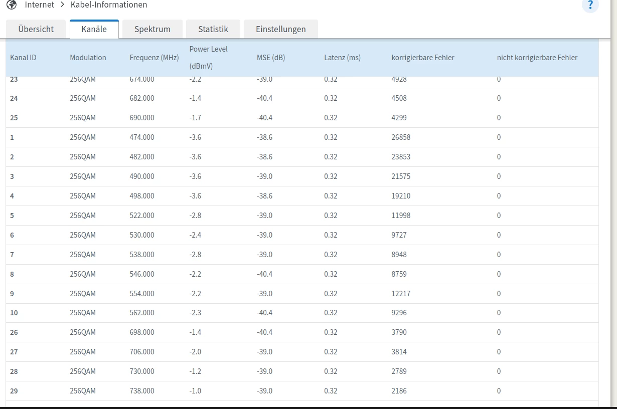 Dass Soll in Empfangsrichtung ist 4096QAM, für Docsis 3.1 (D3.1) und 256QAM für Docsis 3.0 (D3.0)).