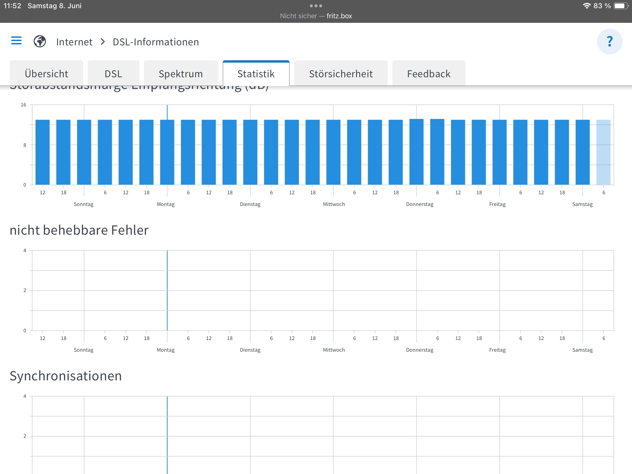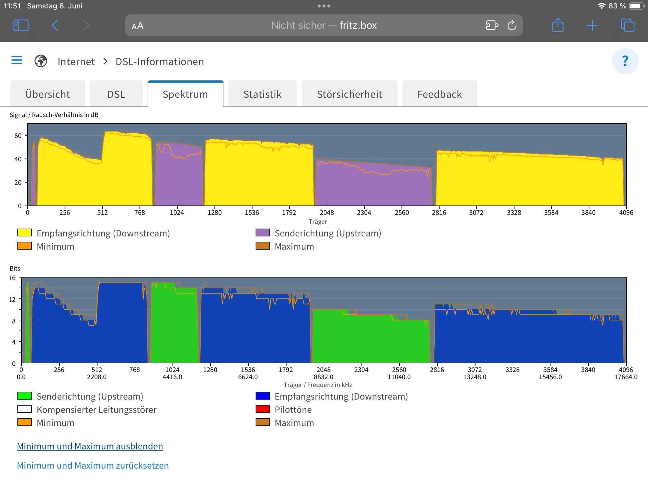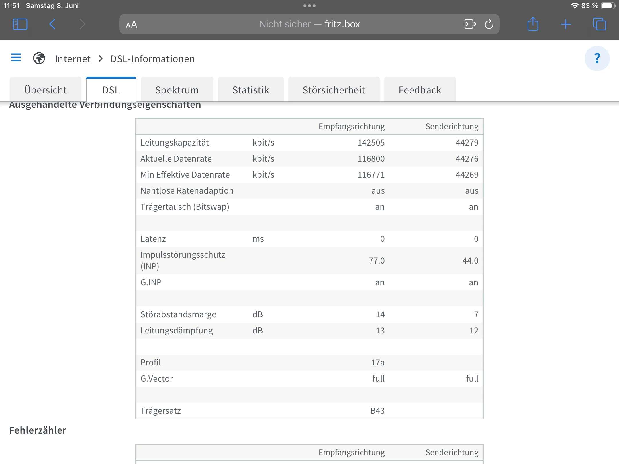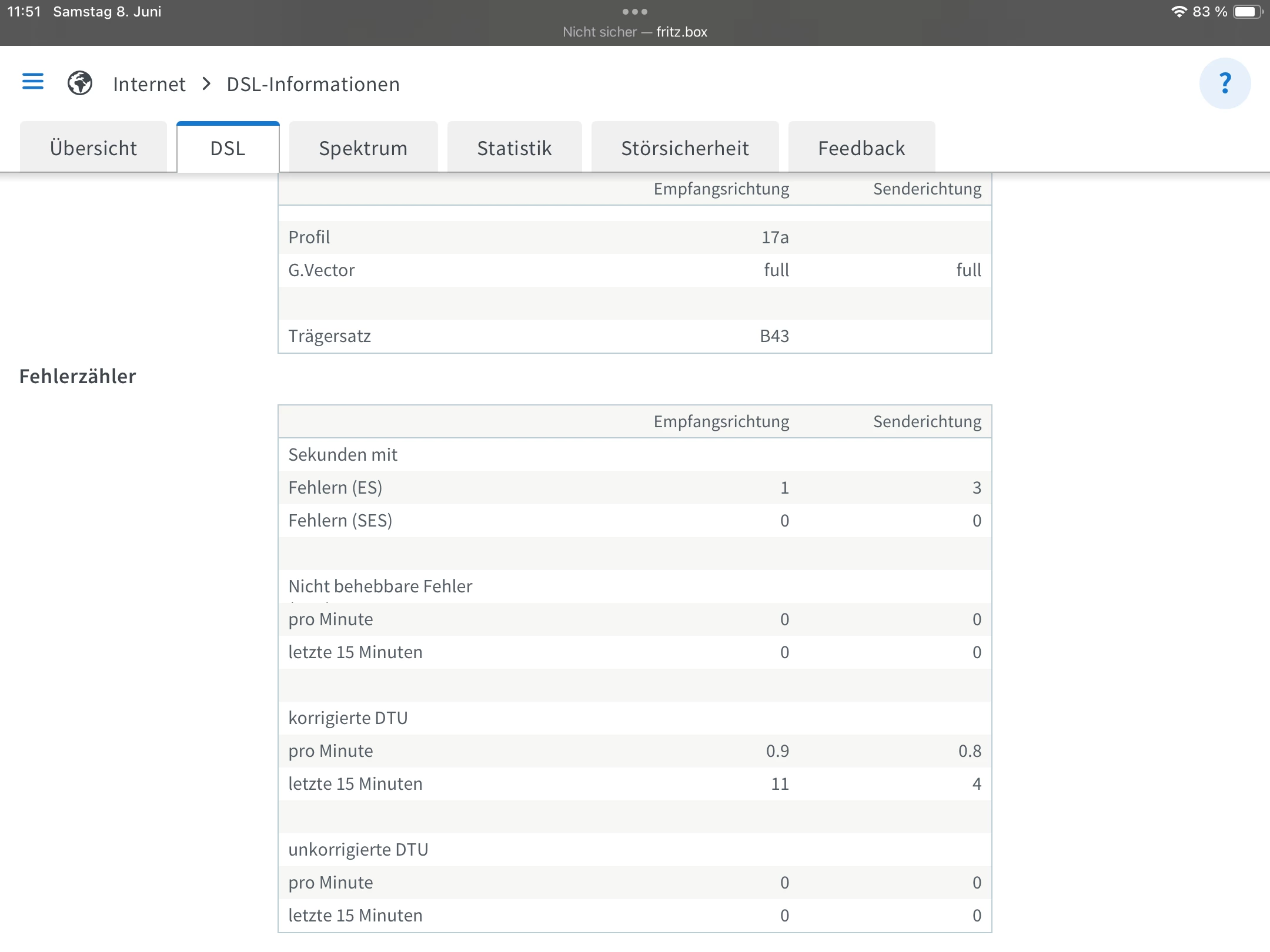 @StefanB1981 Könntest Du dann bitte aus der Fritzbox Screenshots von Internet/DSL Informationen/ Tab DSL (inkl. DTU Fehler Anzeige), Tab Spektrum (Min und Maxium anzeigen aktivieren) und Tab Statistik (1 Woche anzeigen) hier einstellen? Danke.