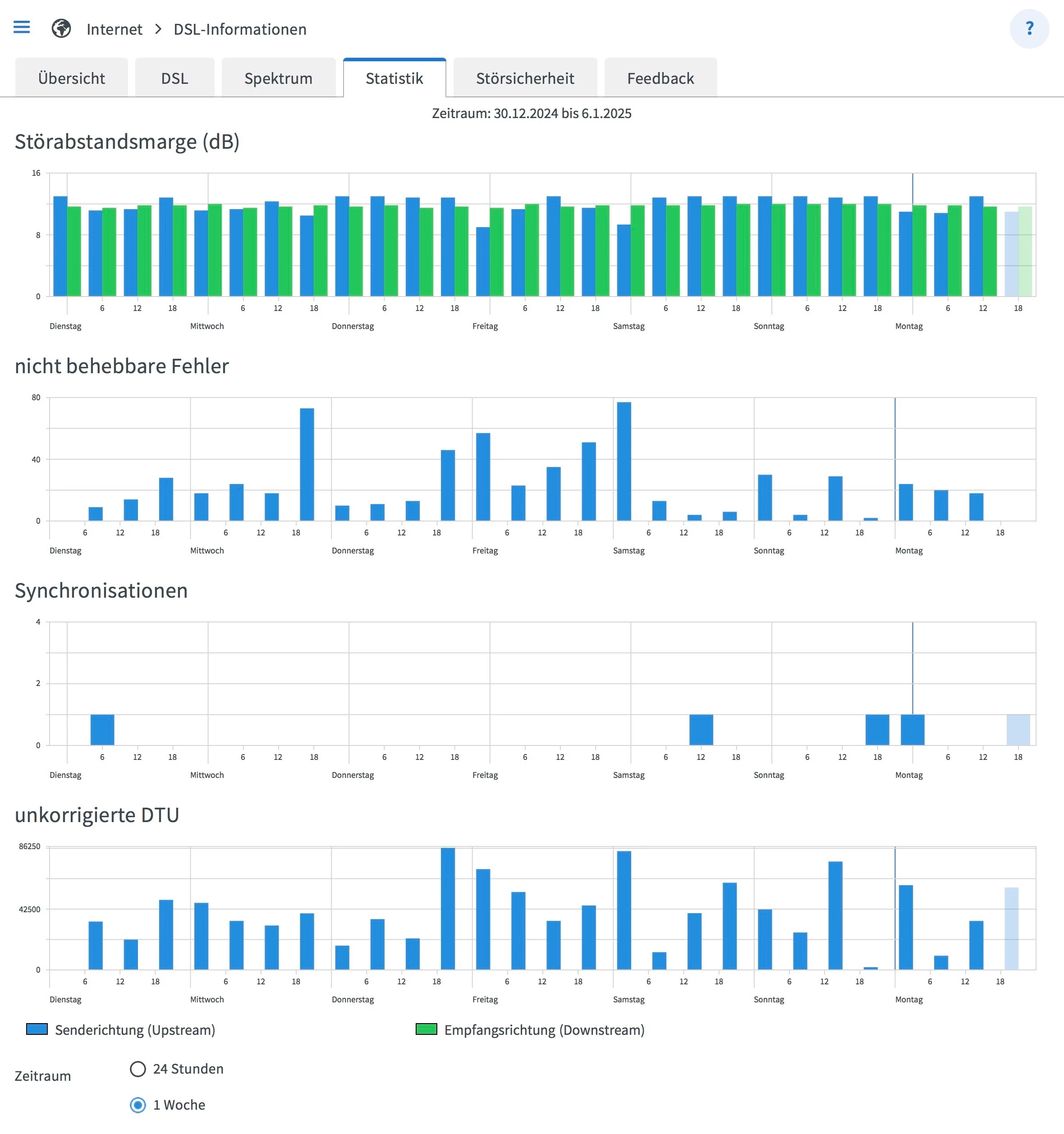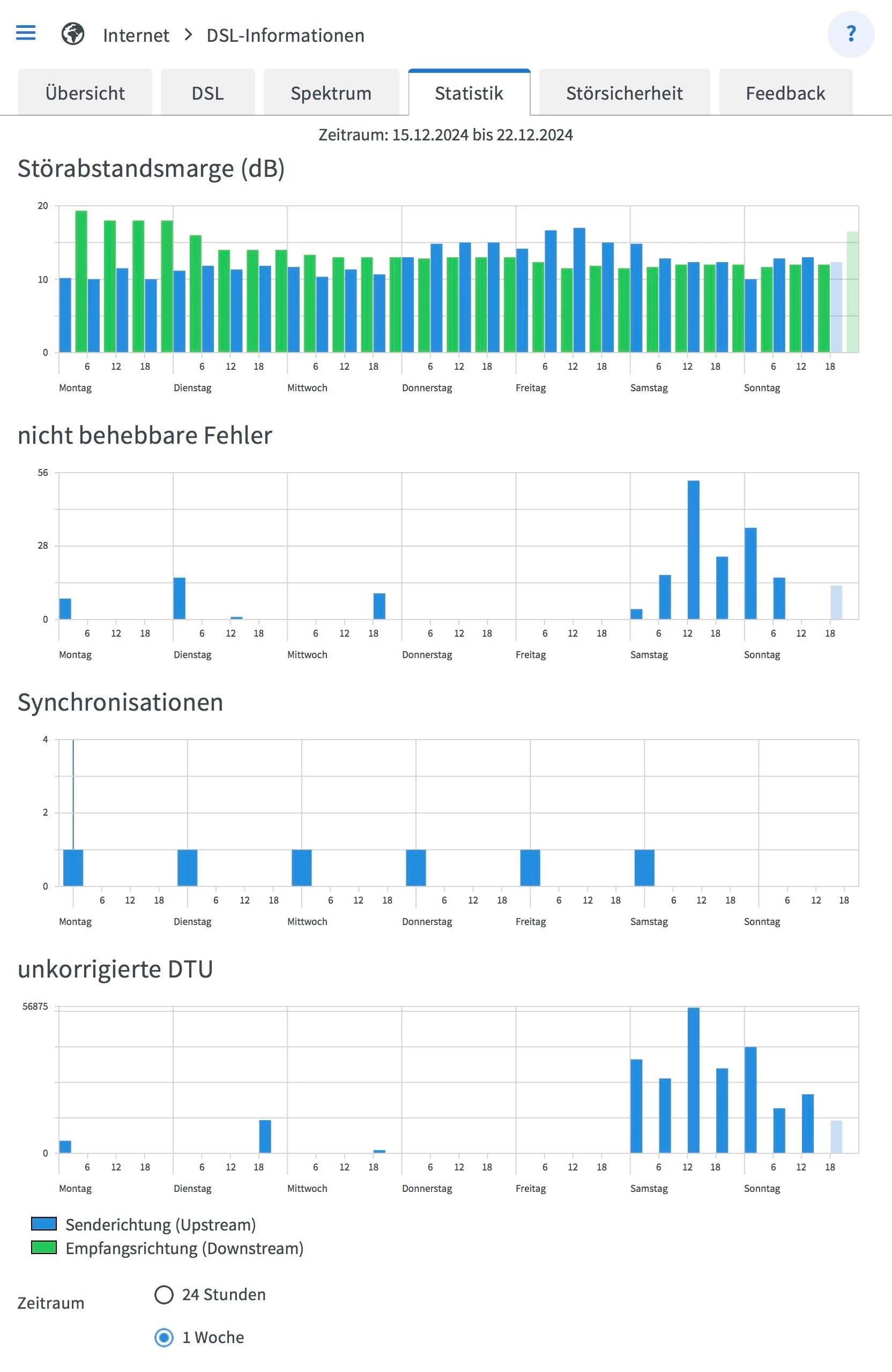 Ich habe mir noch mal meinen Beitrag von vor 14 Tagen angesehen, dort hatte ich ebenfalls die Statistik gepostet. Dort hatte man die täglichen resyncs zum einstellen der geschwindelt und des Signals gesehen. Ab dem Zeitpunkt, an dem die finale geschwindelt erreicht war, drögen die nicht behebbaren Fehler und unkorrigierten DTU rasant an und sind seitdem konstant da, wohingegen sie vor recht gering waren.