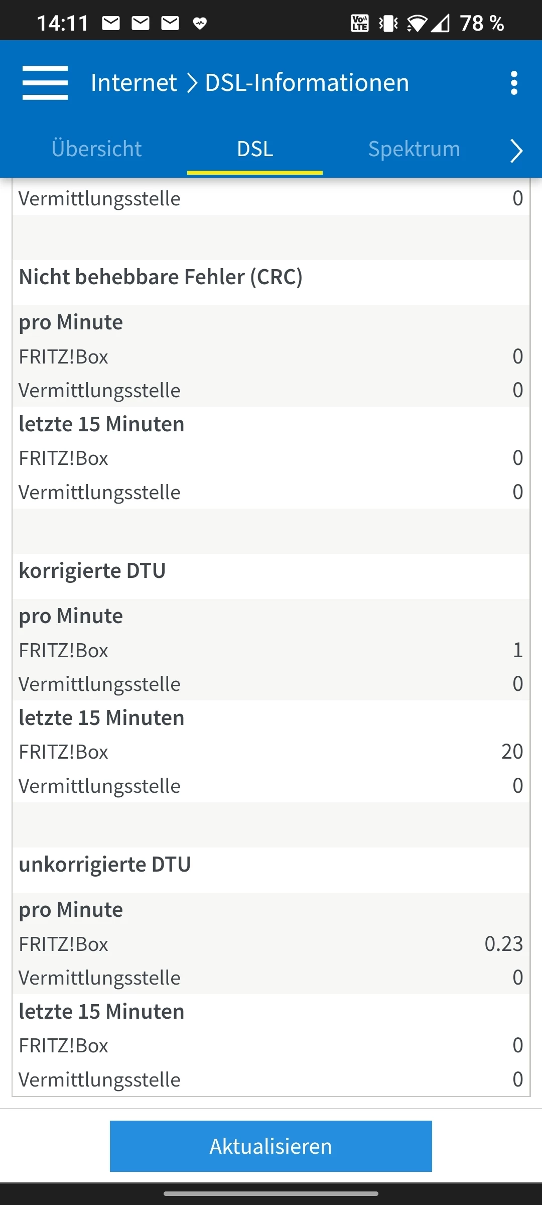 Kannst du mal einen Screenshot der Tabelle “DSL” unter “DSL-Informationen” mit allen Leitungswerten und incl. untenstehenden Fehlerzählern posten?