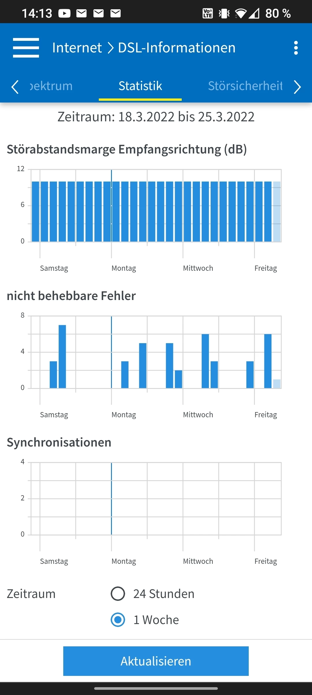 @o2_Giulia Seit gestern gibt es zwar etwas mehr Fehler (vielleicht liegts am Wetter ), aber mit den aktuellen Einstellungen gab es seit drei Wochen keine Neustarts oder Rysncs mehr. Es sieht mir mittlerweile nach einem externen Störer aus, da von Sonntag bis Dienstag keine Fehler oder maximal 1-2 auftreten (gleiches Verhalten in den letzten drei Wochen). Aber wenn das in Ordnung ist, dann ist es ja gut.