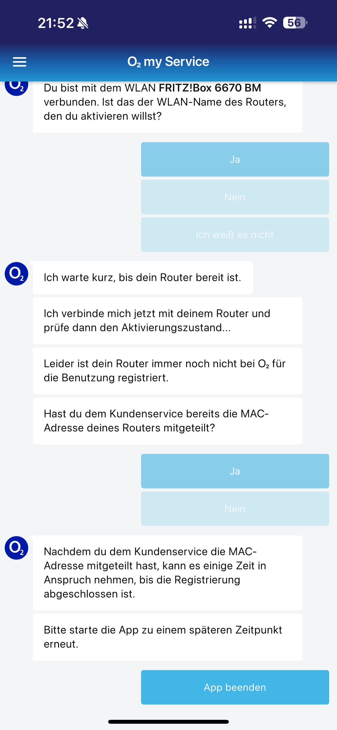 ich habe Probleme bei der Aktivierung meines eigenen Routers. Die MAC-Adresse habe ich bereits mindestens fünfmal angegeben, aber jedes Mal wird mir nur gesagt, dass die Aktivierung in den nächsten Stunden erfolgen sollte. Leider habe ich nach fünf Tagen immer noch keinen Empfang.