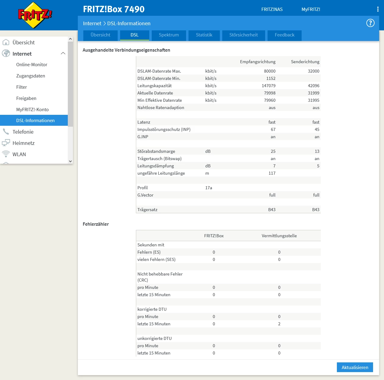 Und nun noch bitte den Screenshot der Tabelle “DSL” mit allen Leitungsparametern.