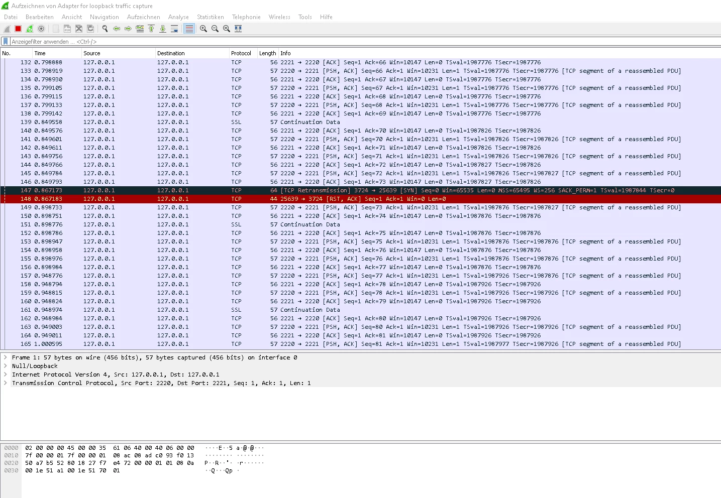 Dein erster Screenshot zeigt lokalen Traffic auf Loopback via 127.0.0.1, also Local Host. Was da genau bei Dir auf den Ports den Traffic verursahct ist schwer zu sagen, da es sich hier um einen Bereich handelt, der von unterschiedlichen Anwendungen genutzt wird. Ein Retransmit ab und zu ist relativ normal.