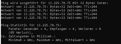 Antwort von 13.225.78.75: Bytes=32 Zeit=6ms TTL=244