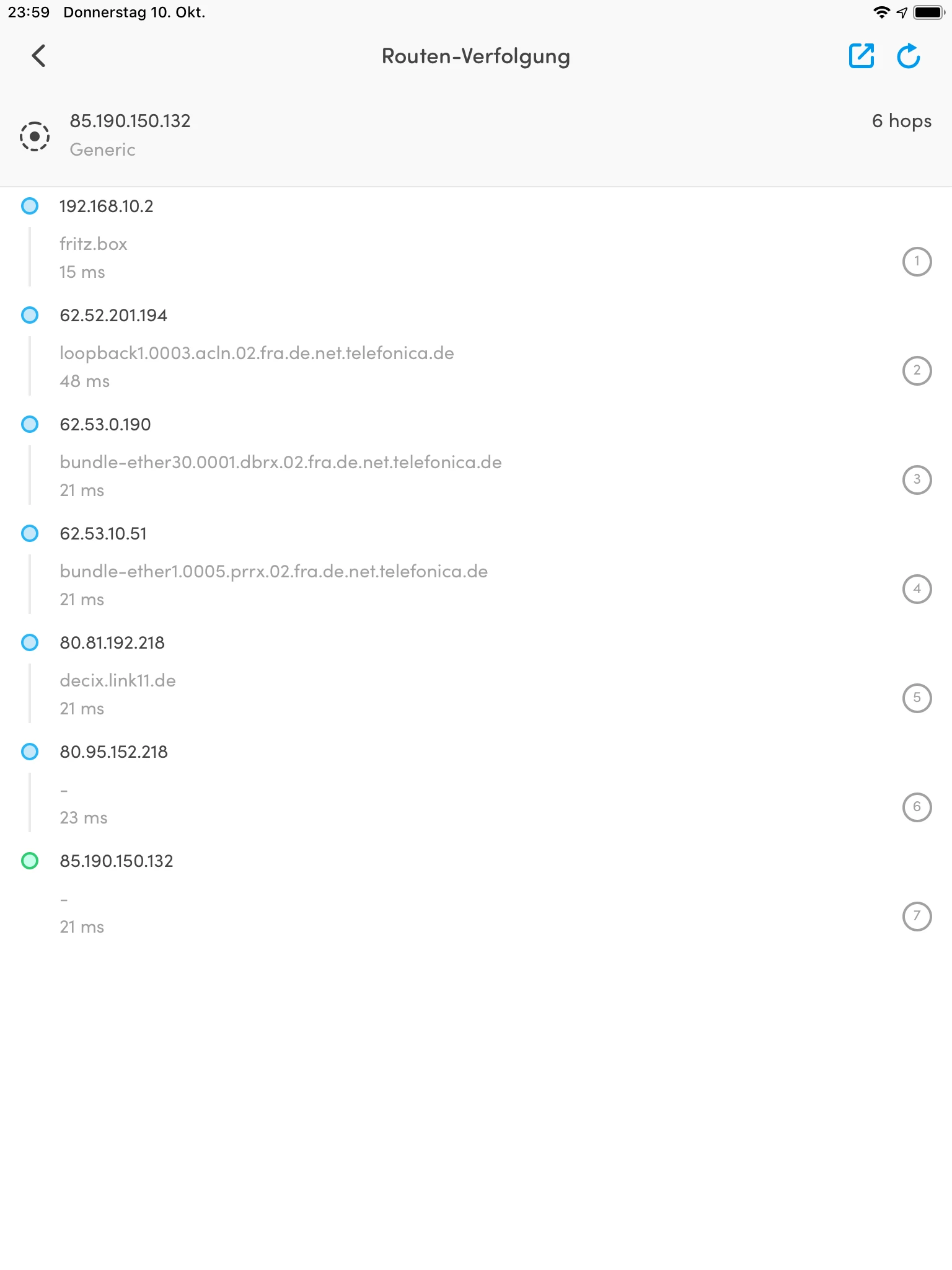 Antwort von 85.190.150.132: Bytes=32 Zeit=6ms TTL=56