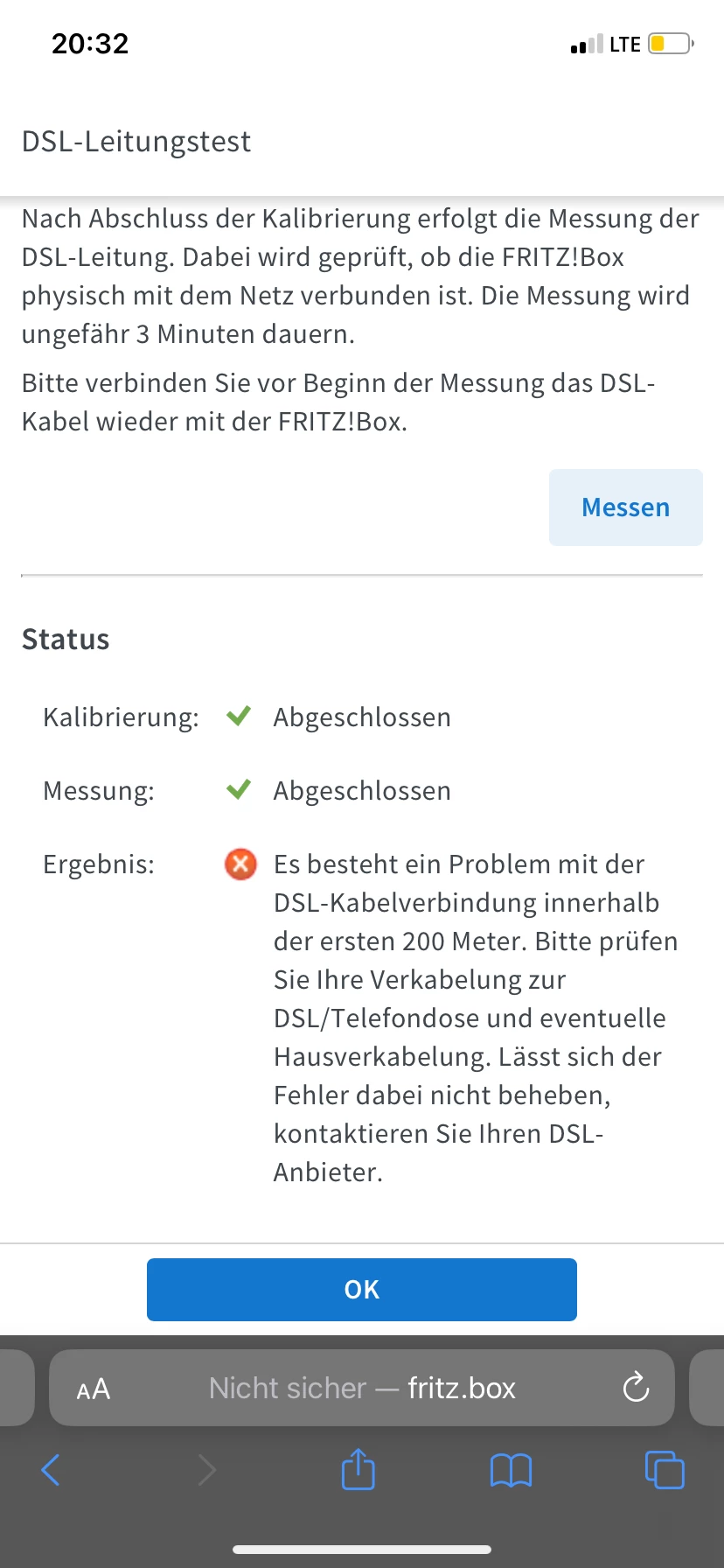 Ich habe noch eine Messung und Kalibrierung gemacht, dort steht es gäbe ein Problem mit der Kabelverbindung innerhalb der ersten 200 Meter bedeutet das das Dsl kabel ist kaputt?