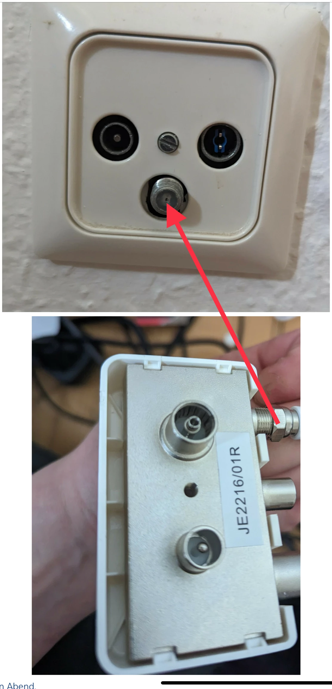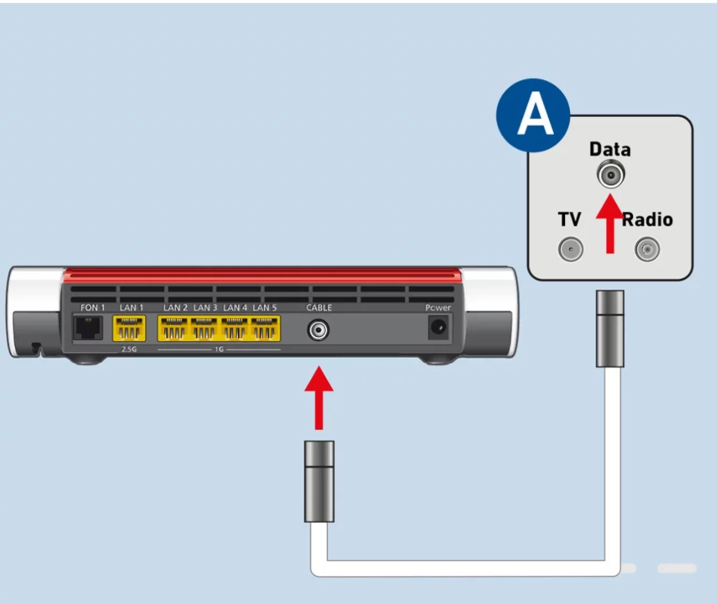 Und das Kabel vom Ursprung roter Pfeil kommt auf die Buchse auf die der Pfeil zeigt… die andere Seite in des Kabels kommt auf den Anschluss am Router.
