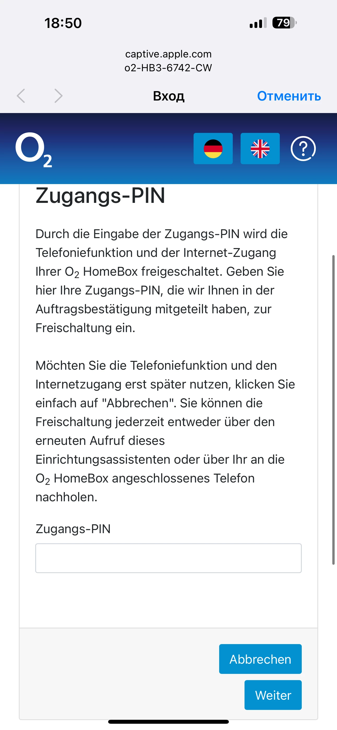 Sie haben die Zugangs-PIN noch nicht eingegeben. Die o2 HomeBox kann daher nicht für die Telefoniefunktion und den Internetzugang genutzt werden. Sie können die Freischaltung jederzeit entweder über den erneuten Aufruf dieses Einrichtungsassistenten oder über Ihr an die o2 HomeBox angeschlossenes Telefon nachholen