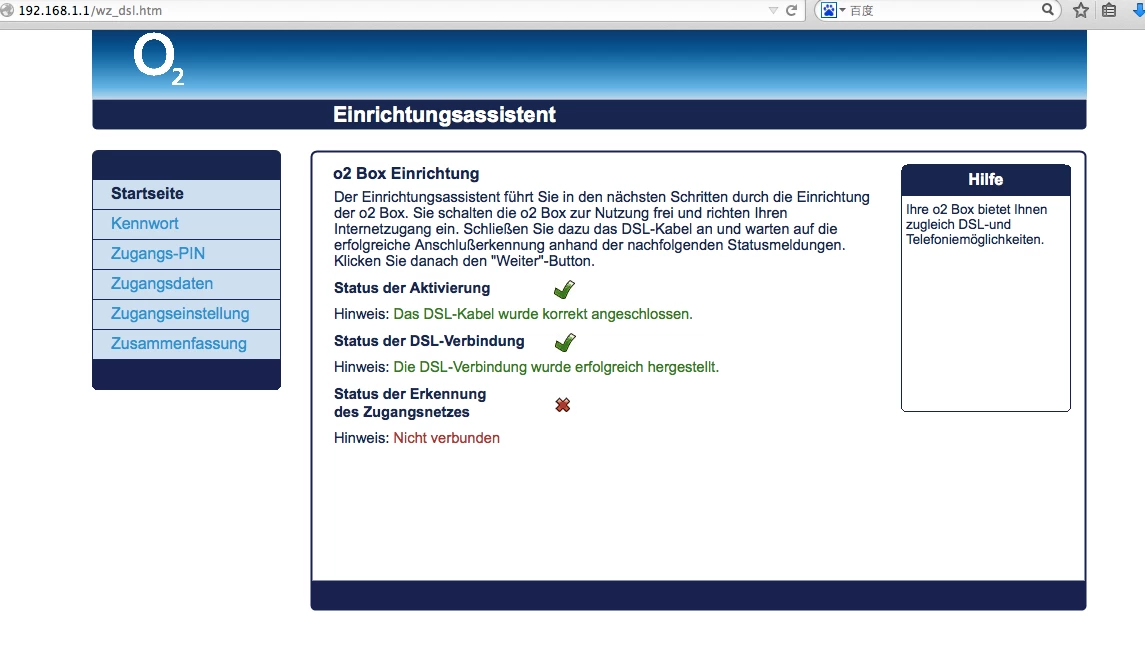 durch mehrfächigen Versuch bei der Terminvereinbarung hat der Techniker vom Telecom heute endlich den Anschluss freigeschaltet. Das Licht DSL vom O2Box 6431 leuchtet nun dauerhaft grün. Allerdings  bekomme ich beim Einrichtungsassistent die Fehlermeldung Status der Erkennung des Zugangsnetzes - Nicht verbunden. Das Licht Info vom O2Box ist rot. Im Anhang steht es ein ScreenShot dafür.