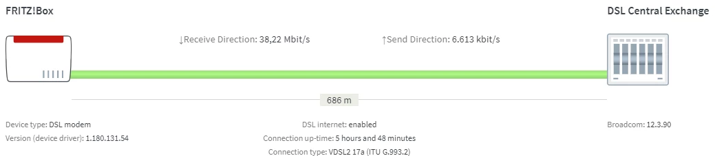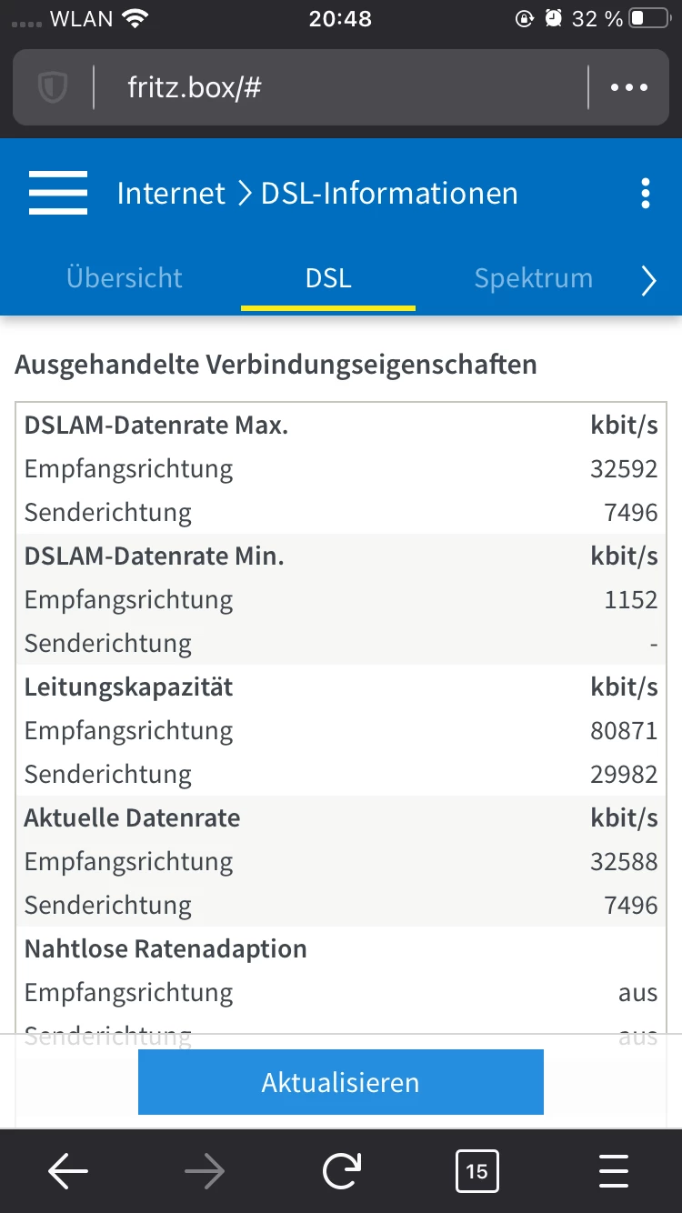 Hast du die Fritzbox mal neu gestartet? Wenn ja, poste bitte einen aktuellen Screenshot der Tabelle unter dem Reiter “DSL” Tabelle mit allen Leitungsparametern.