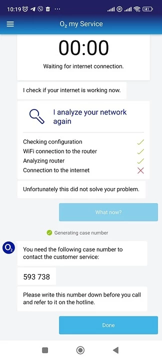 Seitdem habe ich die Hotline mehrmals angerufen, aber damals wurde eine Störung der Verbindung zu meiner Adresse festgestellt. Die Mitarbeiter von O2 sagten mir, es sei ihr Problem, sie seien sich des Problems bewusst und alles würde bald behoben werden. Ich müsse nur noch bis zum 31.12.2023 warten.