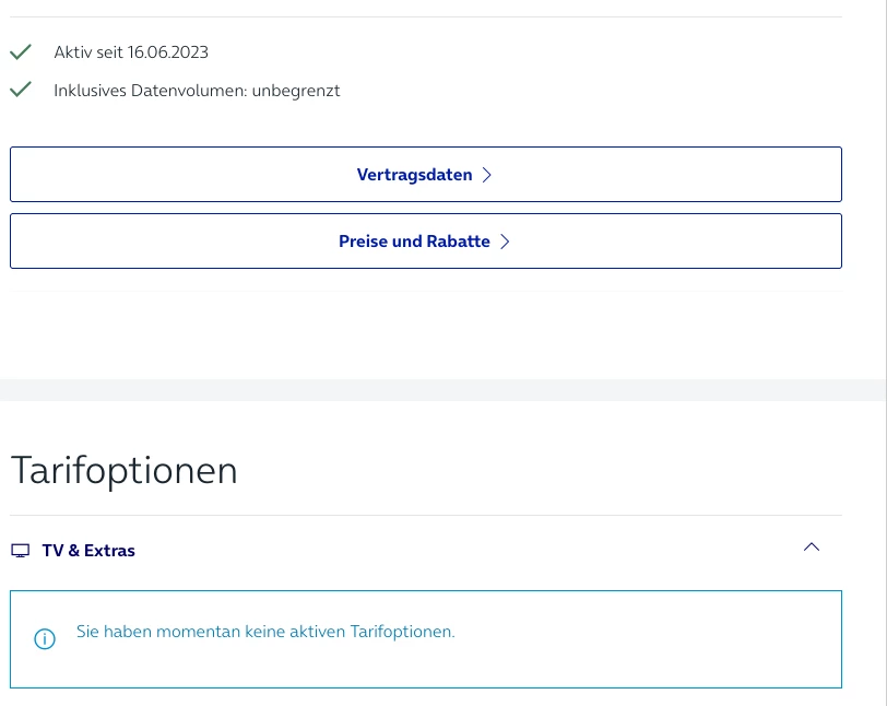Danke für Deine Antwort, leider habe ich dieses Menu bei den Tarifdetails (oberer Teil, nur Tarif und Nr. keine Links ausgelassen) nicht, ich kann mir meine Vertragsdaten mit einem Pop-up ansehen und nichts ändern. Alle anderen weiteren Links (auch weitere unten nicht im Screenshot ersichtlichen Links) führen lediglich nur zu weiteren Angeboten. Da ist wirklich nichts, habe lange verzweifelt gesucht.