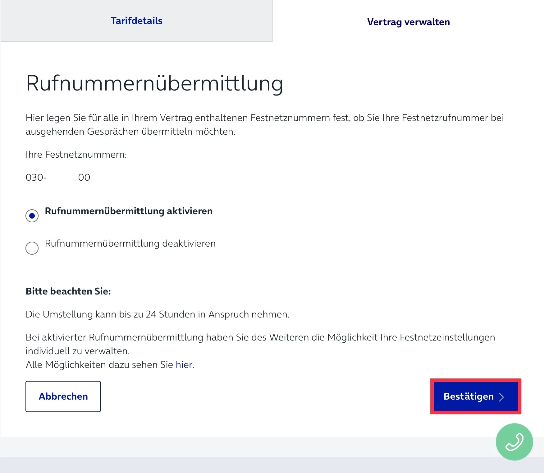 eine Änderung der Einstellungen in der Verwaltung-Seite des Vertrages → Festnetzeinstellungen, ist ebenso nicht möglich, dort kann ich nur temporär eine Rufnummernunterdrückung festlegen, eine generelle Rufnummernunterdrückung aber nicht aufheben. Für einen kleinen Tipp wäre ich dankbar.