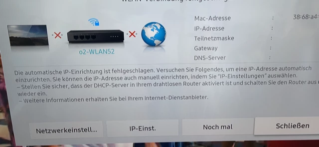 Es geht um meinen Samsung-TV. Dieser war problemlos 2 Jahre über meinen Router mit dem Internet verbunden. Dies ist jetzt nicht mehr der Fall und ich erhalte die beiden Fehlermeldungen, die beigefügt sind.