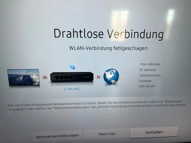 Zum Einen sei das eingegeben Netzwerkkennwort falsch. Dies ist aber definitiv nicht richtig. Ich habe das WLAN-Passwort extra mal geändert und konnte PC, Laptop und Handy problemlos verbinden. Nur der TV gab die Fehlermeldung, dass das Netzwerkkennwort falsch war.
