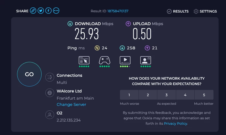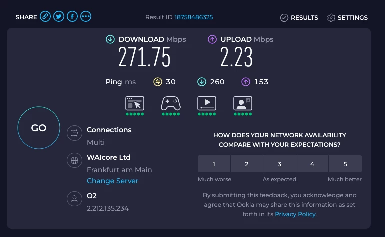 Ping 16, Download 250, Upload 40