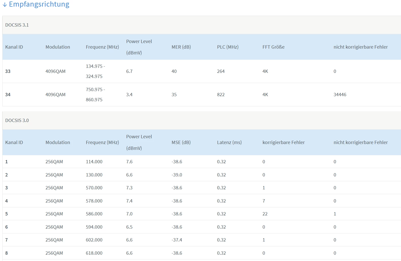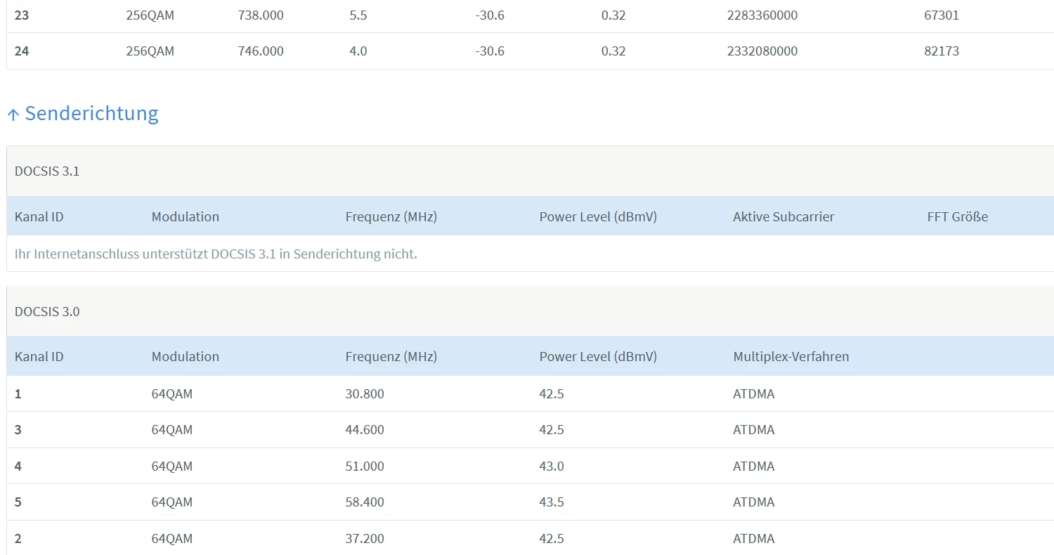 Sollten da nicht in Empfangsrichtung mehr Kanäle sein? Ich habe dort 33 und in Senderichtung ist DOCSIS 3.1 nicht aktiv? Der TE hat doch eine Gigabit-Leitung?
