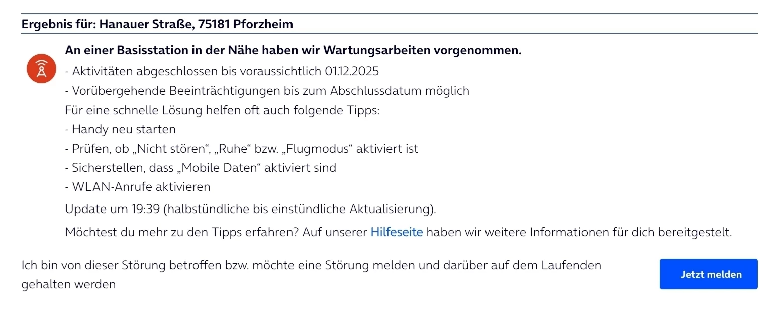 Eine Großstörung ist uns aber aktuell nicht gemeldet. Ich habe gerne einmal unter der von dir genannten Adresse nachgeschaut, dort werden aktuell Wartungsarbeiten durchgeführt. Sie sollen am 03.12.2025 abgeschlossen sein.