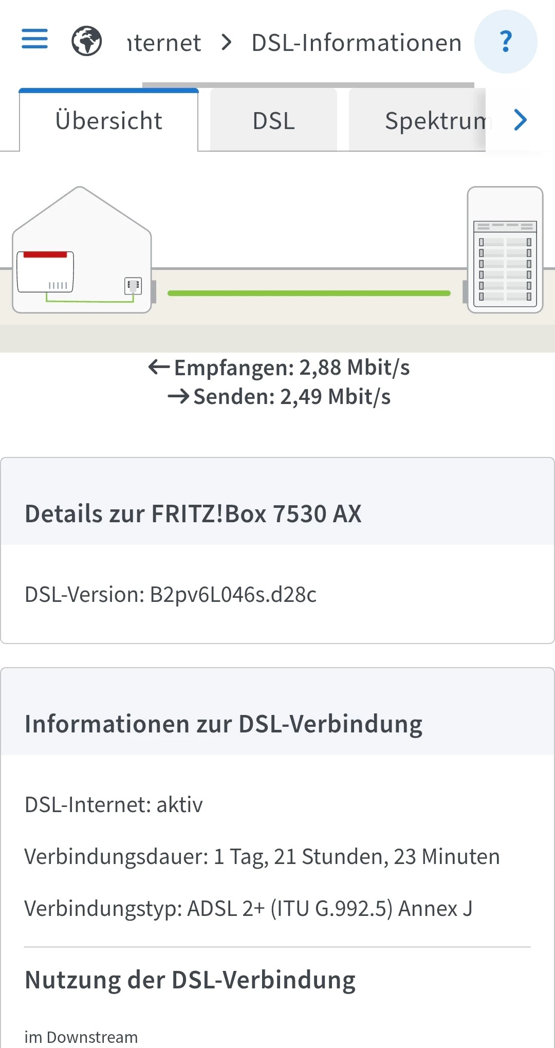 Seitdem gab es keine Abbrüche mehr und der Wert ist bislang konstant auf 2,6 Mbits Down-und 2,2 Mbits Upload.