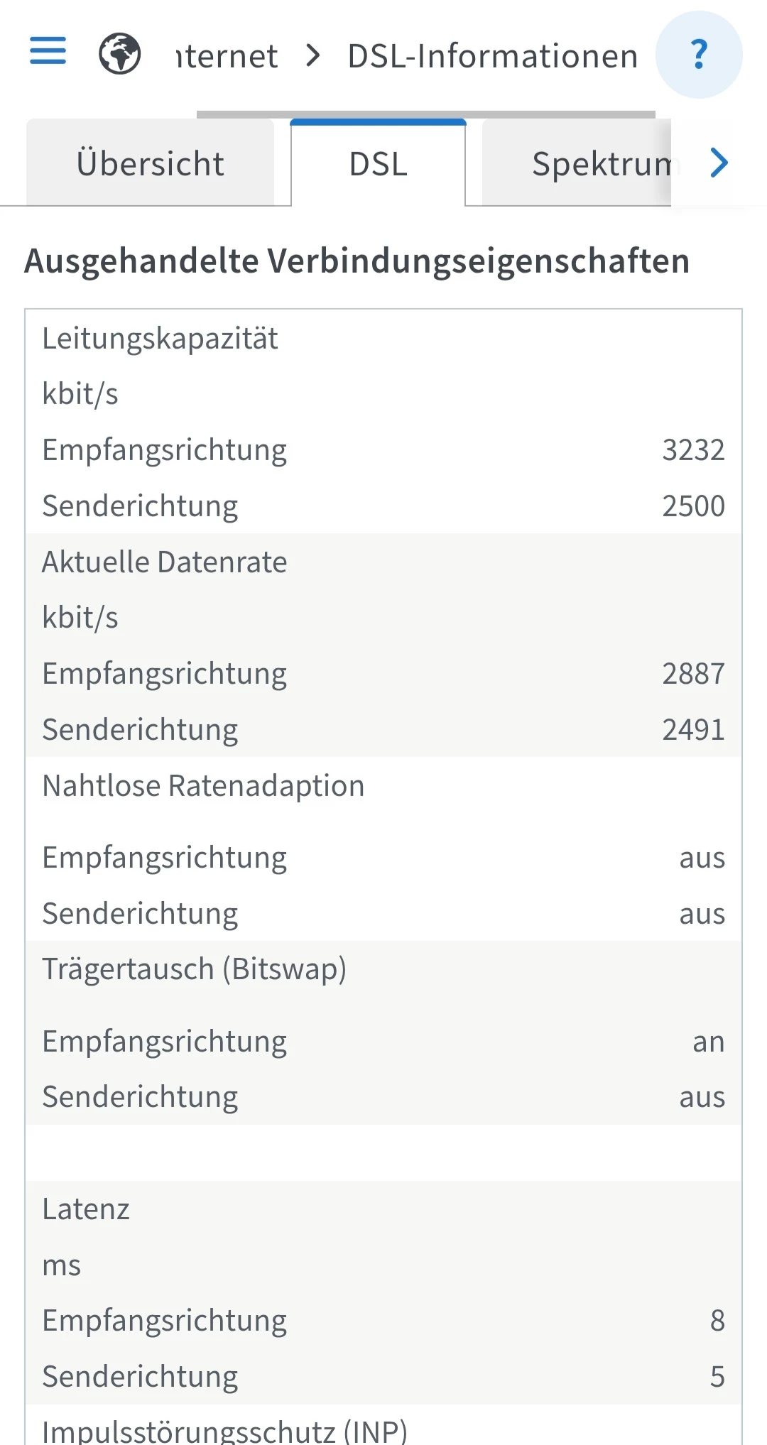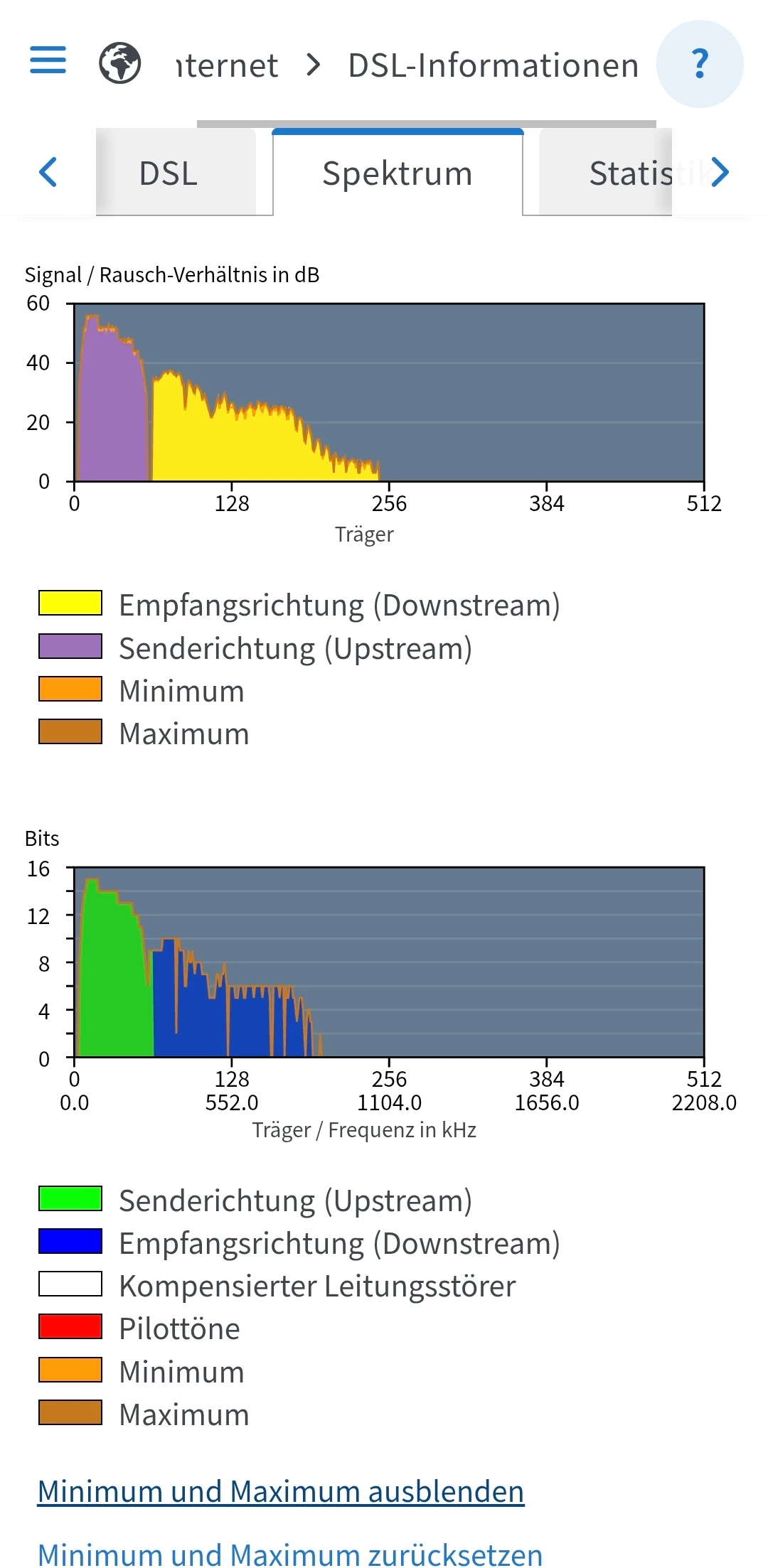 Poste doch nochmal die SNR- und Bitloading-Spektra (vorher den Link “Minimum und Maximum anzeigen” anklicken).