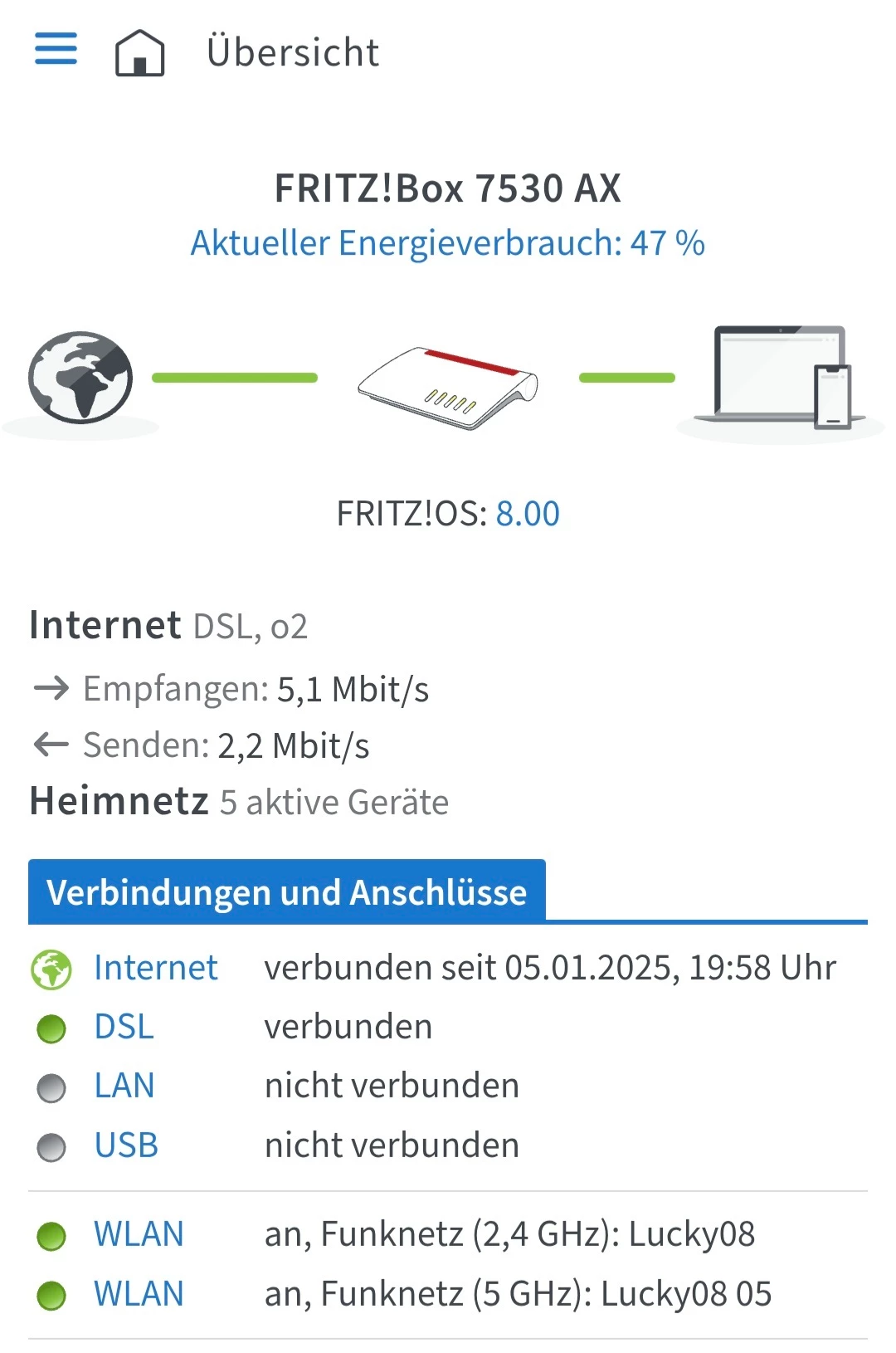 Jetzt nach dem Neustart 5,1 Download und 2,2 Upload.
