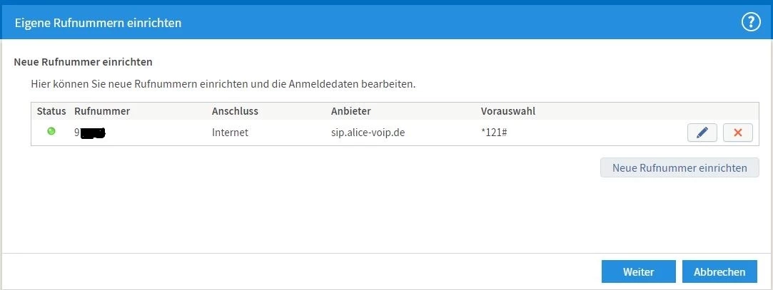 Dabei bitte darauf achten, dass die Telefonnummern nicht manuell eingetragen werden. Im  Einrichtungsassisstenten hier den entsprechenden Punkt überspringen. Die Nummern konfigurieren sich nach ein paar Minuten selber.