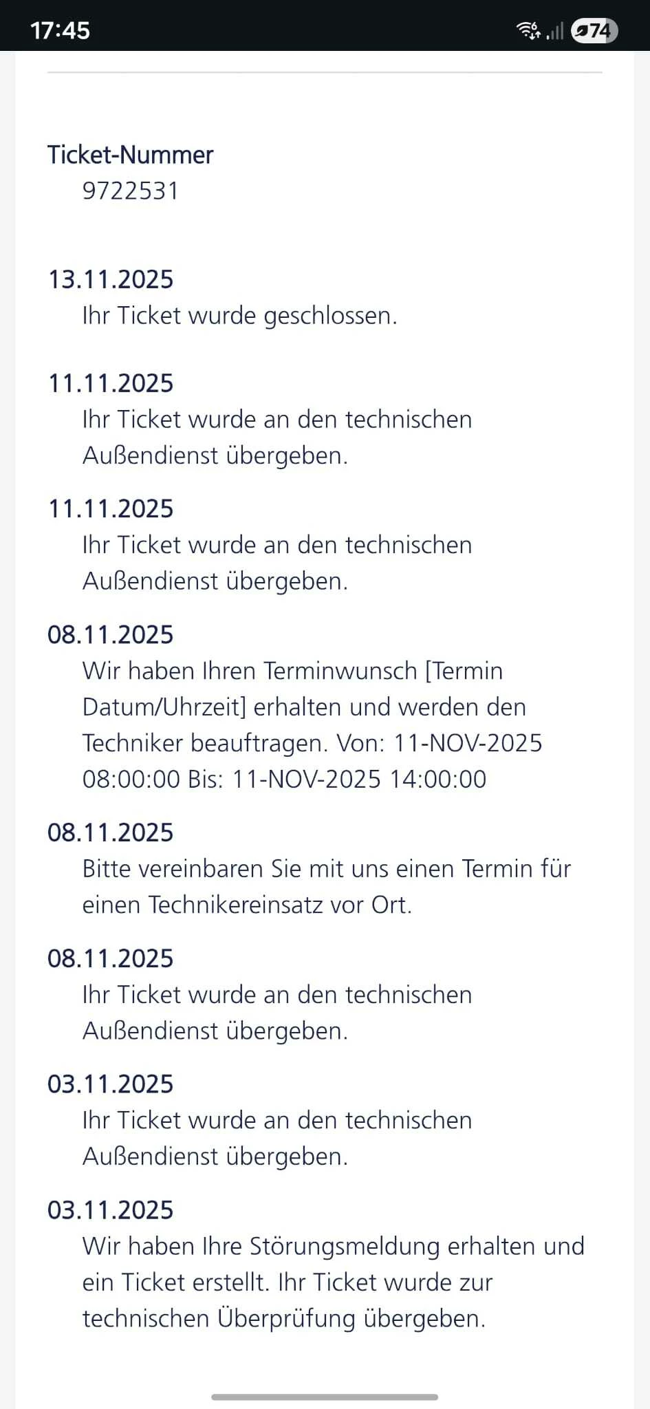 ich weiß nicht ob meine nachbarn auch das problem haben aber wahrscheinlich nicht da ich in einer wohnung lebe und die meisten nachbarn bei den anderen fragen ob es bei ihnen auch so ist und der außendienst mit dem ich einfach das meine was im ticket steht weil eigentlich im ticket ein techniker termin ausgemacht wurde aber keiner gekommen ist und mir gesagt wurde das der termin nicht autorisiert war was ich garnicht verstehe und die tickets wurden dann einfach so geschlossen