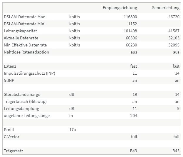 seit einigen Tagen nun schon ist die Datenrate meines DSL-Anschlusses im Download mit ~65 MBit/s weit unter den vertraglich vereinbarten Raten (O2 my Home L). Der Upload scheint mit 32 MBit/s noch in Ordnung zu sein.