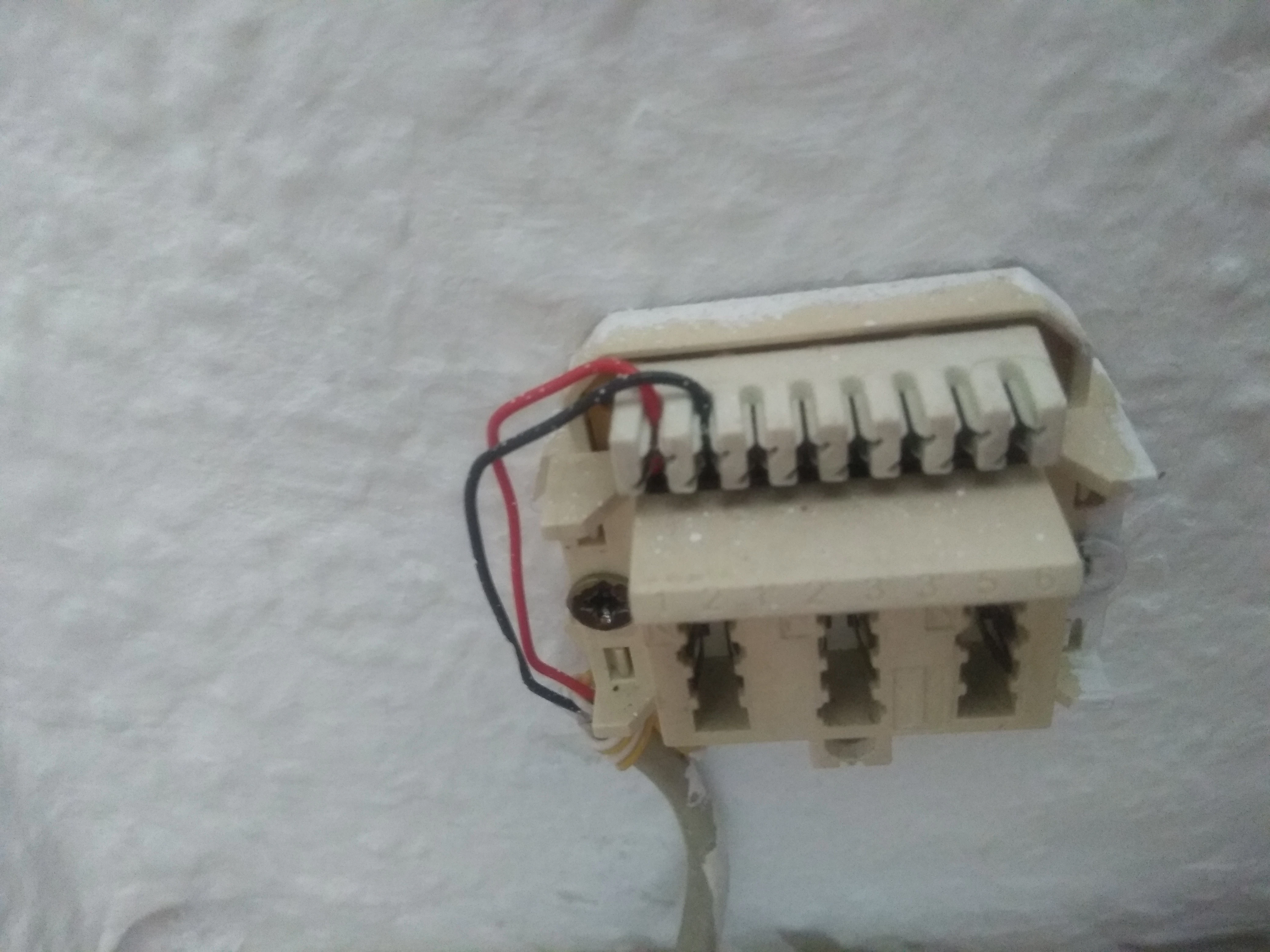 Diese hier müsste die vorgeschaltete sein. Leider war das Fotografieren hier schwieriger. Am unteren Rand erkennt man, wie ein Kabel aus der Buchse geht. Dieses Kabel verläuft dann zur erst gezeigten Buchse. Die Verkabelung kann man leider nur erahnen.
