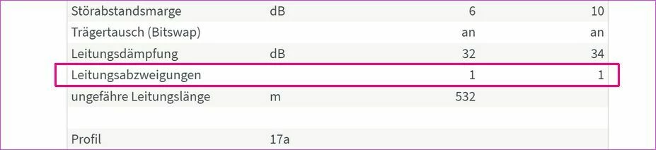 Im EreignissLog der Fritzbox sollte auch stehen, wie lang die Abzweigung ist und wieviel Mbit/s dadurch verlustig gehen.