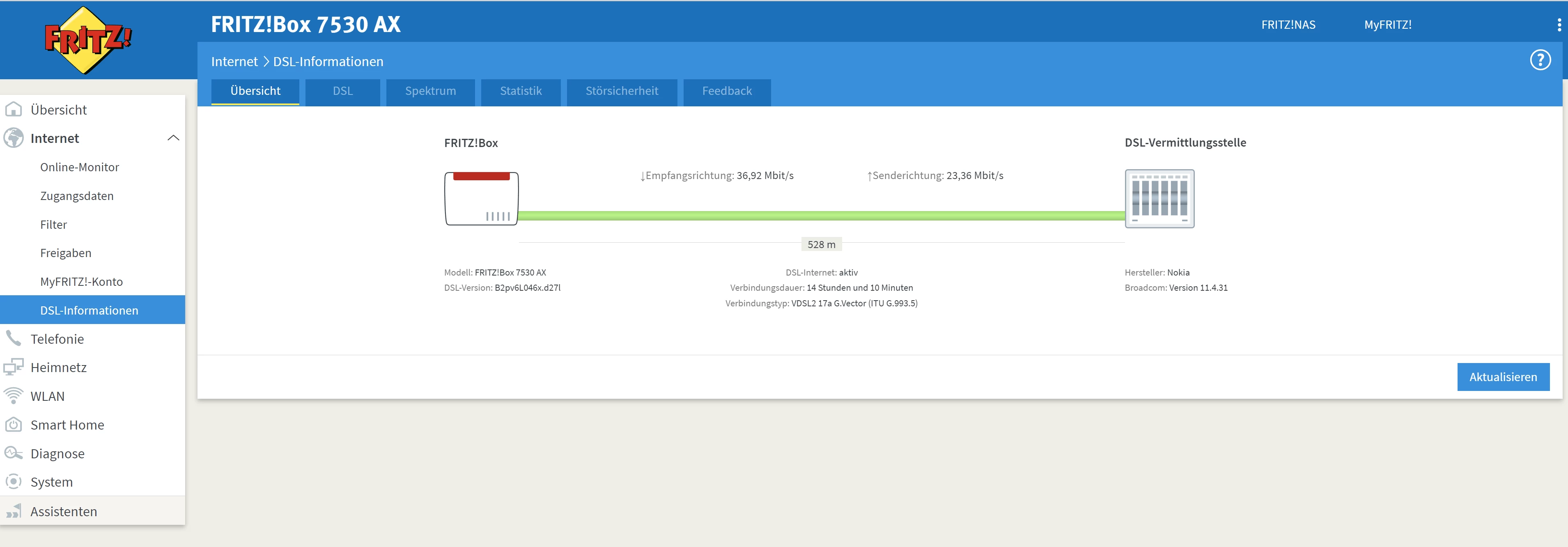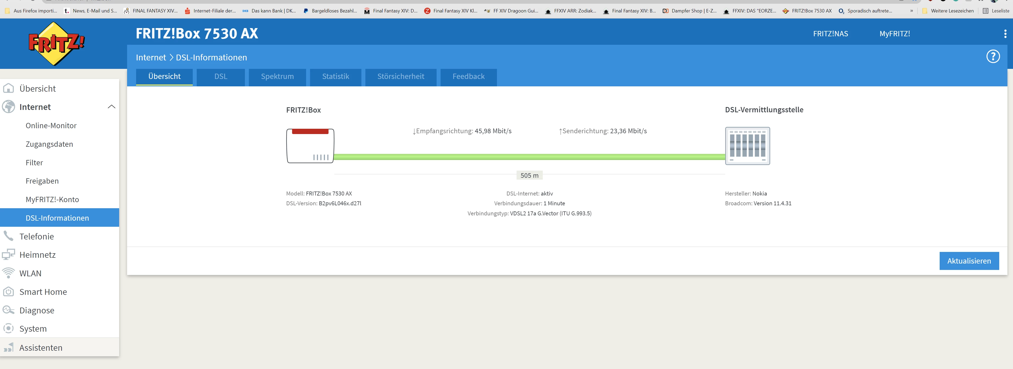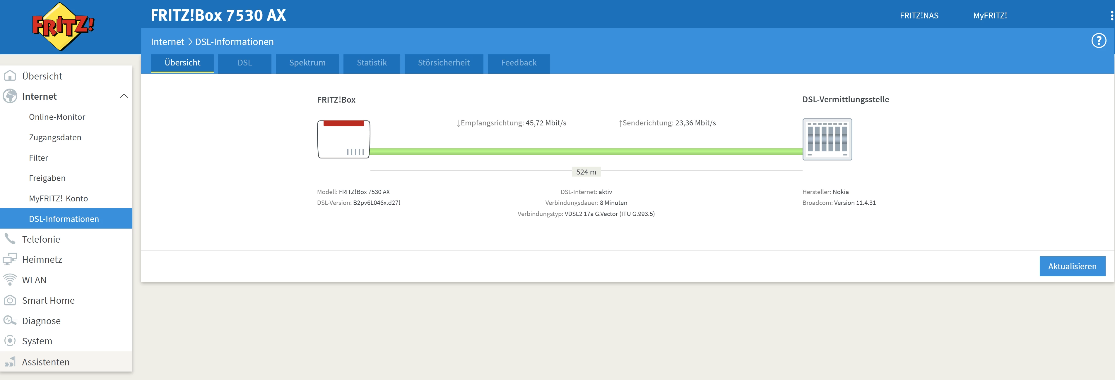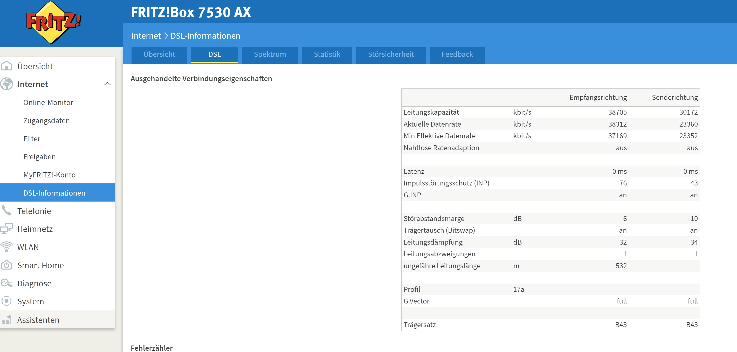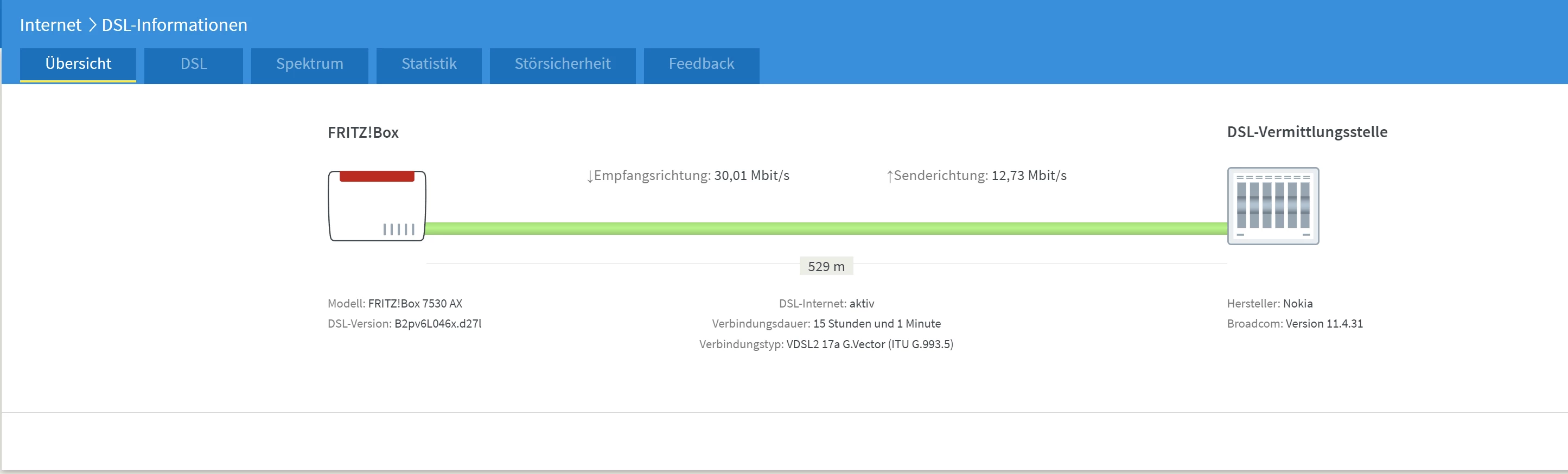 Aktuell ist die Fritbox 7530 AX verbunden aber ich komme nur auf Anschlussinfo.de. Am Montag hatte ich einen erneuten Techniker hier der feststellte das angeblich die Leitung von draußen zu mir nach oben defekt ist. Ich wohne in einer Dachgeschosswohnung. Anbei habe ich mal ein Bild angehängt.