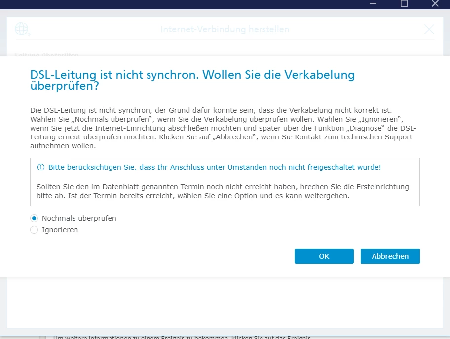 Es kam eine Nachricht die DSL Leitung sei nicht Synchron, hab dann auf Ignorieren gelickt.