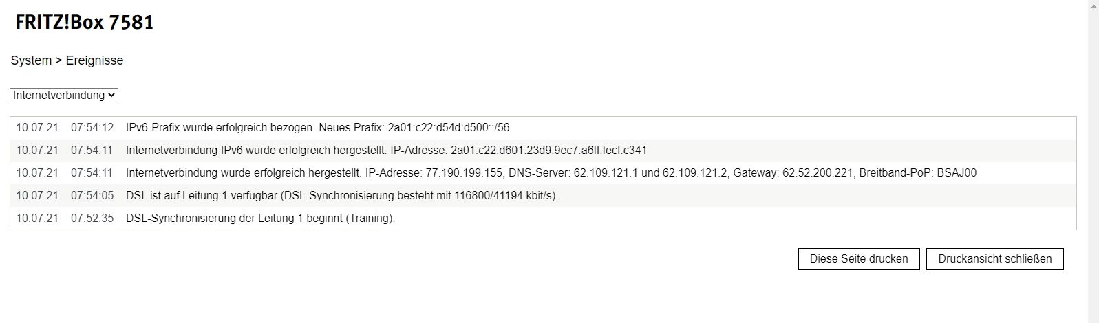 Internetverbindung IPv6 wurde getrennt, Präfix nicht mehr gültig.