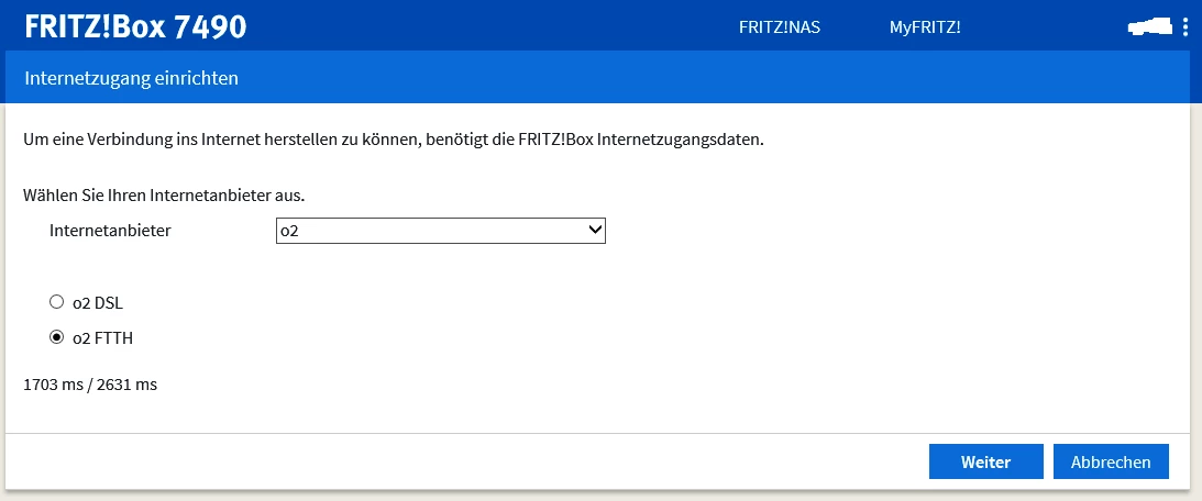 Offensichtlich unterstützt die Fritzbox 7490 auch "o2 FTTH" - also das, was wir im Haus haben (Fiber To The Home) und der Techniker erwähnte -, über die Telekom-Infrastruktur.