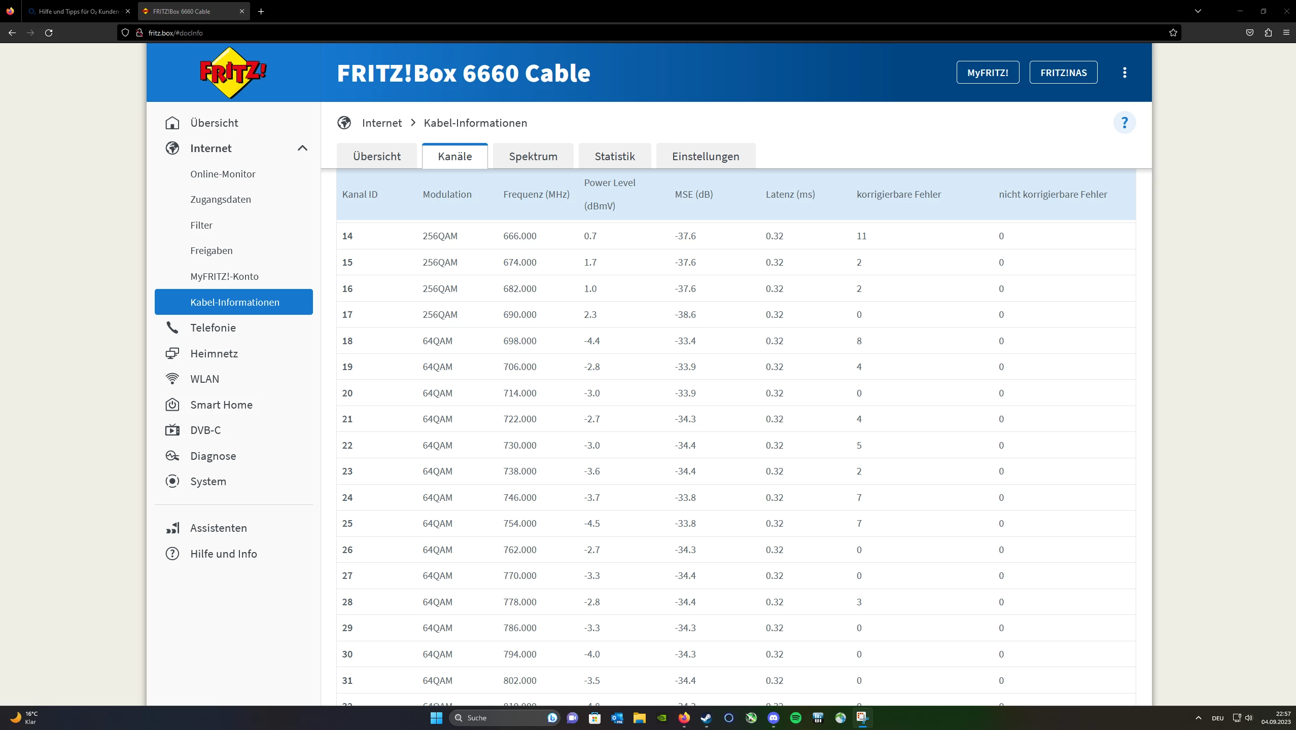 Statistik habe ich nun hinzugefügt. Problem ist, dass ich die Box mehrmals neu gestartet habe, letztes mal um 22 Uhr. Ich hatte aber auf jeden Fall viele nicht korrigierbare Fehler auf allen Kanälen, vielleicht poste ich das morgen nochmal.